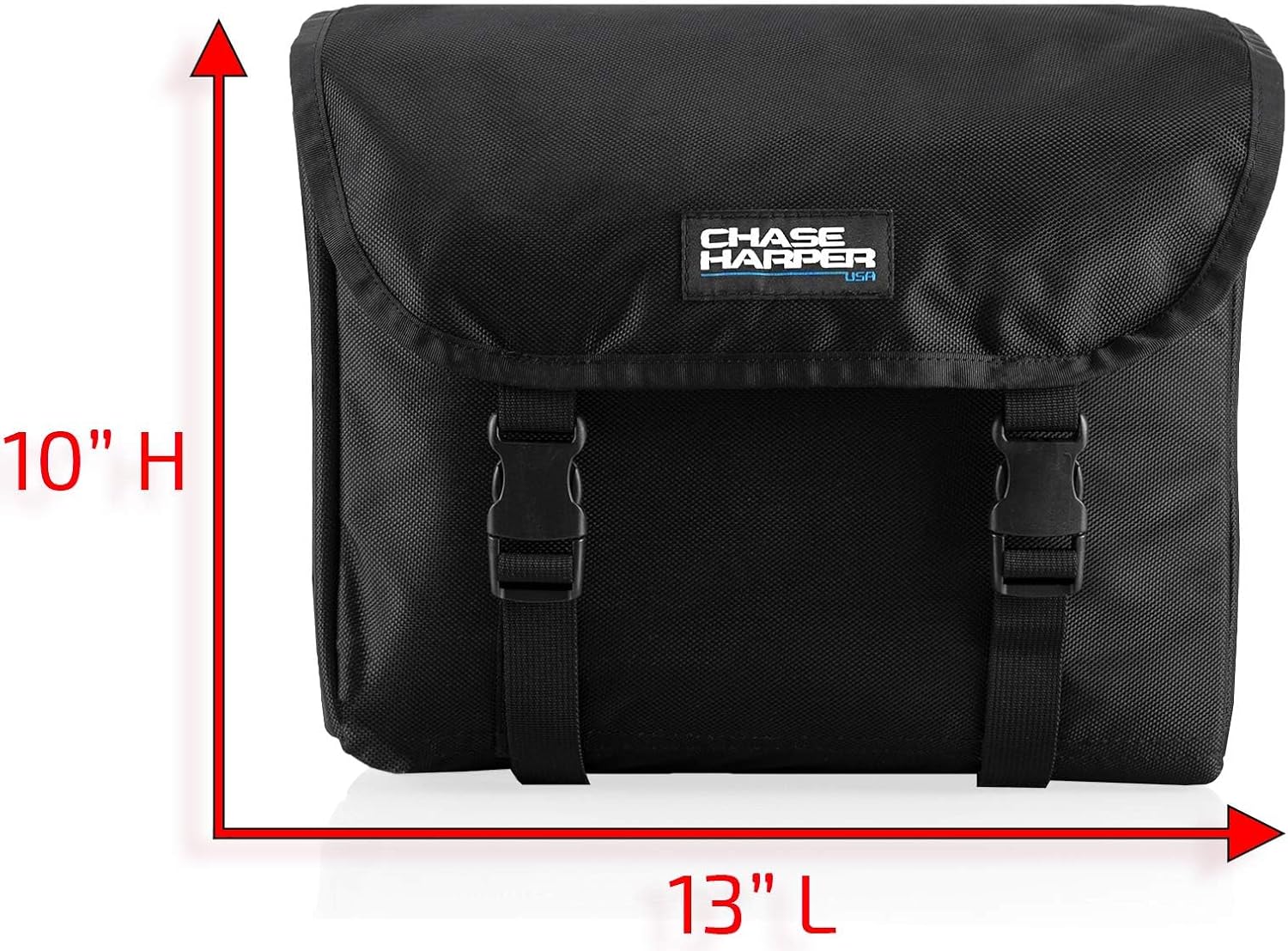 - Adjustable velcro strap mounting harness paired with traditional quick-release loop mounting system for a secure fit while enabling rapid mounting / dismounting. PLEASE NOTE: The strap mounting harness accommodates mounting areas up to 15β wide. If your mounting area is wider than 15β, Chase Harper USA saddle bag mounting harness extenders are available and can be found by typing/copy-pasting Item# B086XLJFHM into the Amazon search above