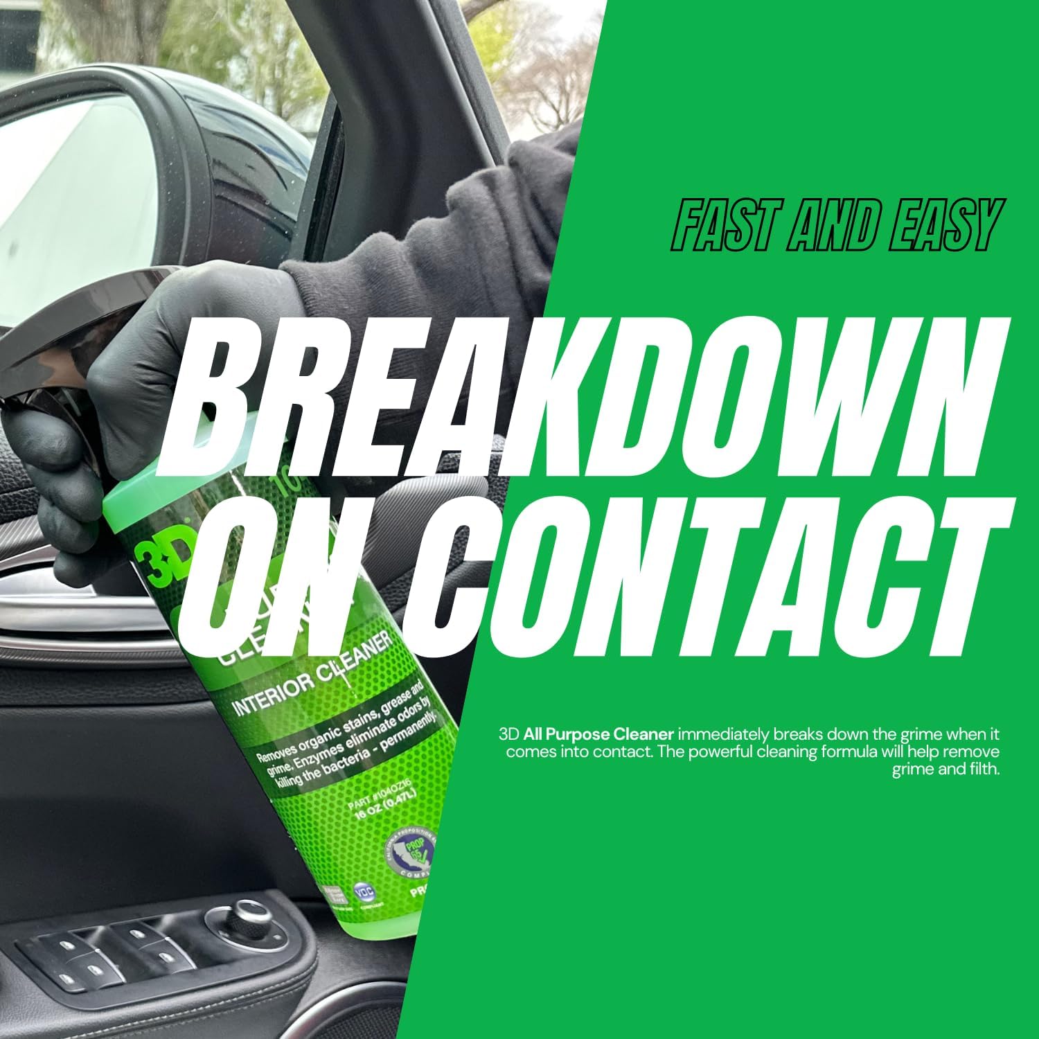 - Neutralizes Stains & Odors at the Source: Thanks to powerful enzymes, this APC doesn’t just mask odors—it eliminates them. From coffee and food spills to biological messes, 3D APC attacks stains and their sources, leaving interiors smelling fresh and looking like they just rolled off the lot