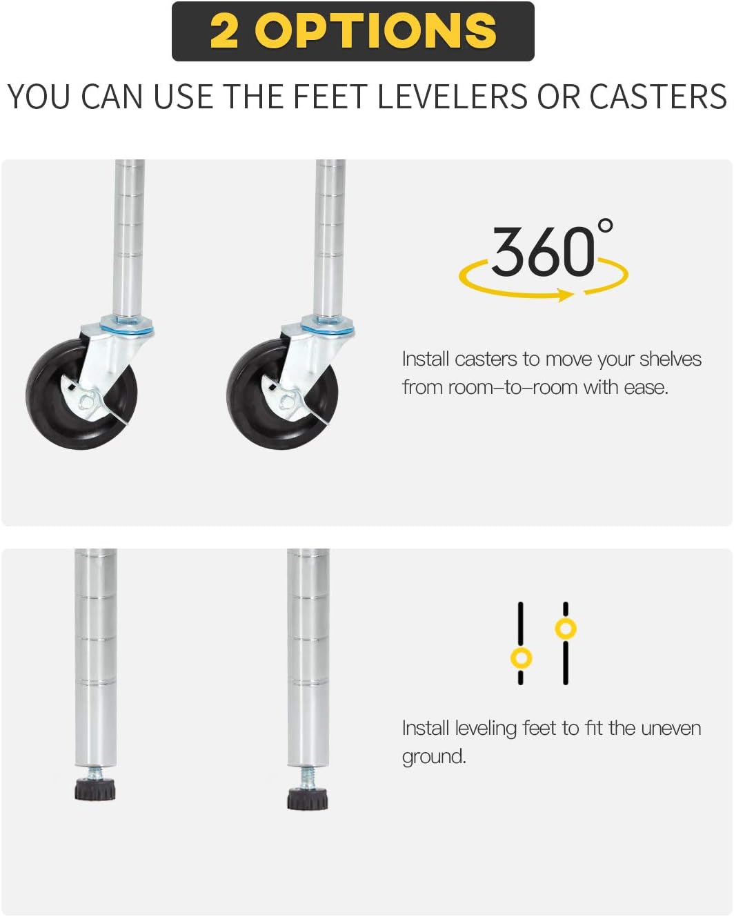 - √【STURDY】: The storage shelves can take a lot of weight. The wire shelving unit use durable steel construction,and to resist dirt buildup and corrosion.The metal shelf is very sturdy.Maximum weight capacity per shelf is 600lbs when equally distributed on feet levelers.Maximum entire unit weight capacity is 600lbs when equally distributed on casters.storage shelves wire shelving unit metal shelf.