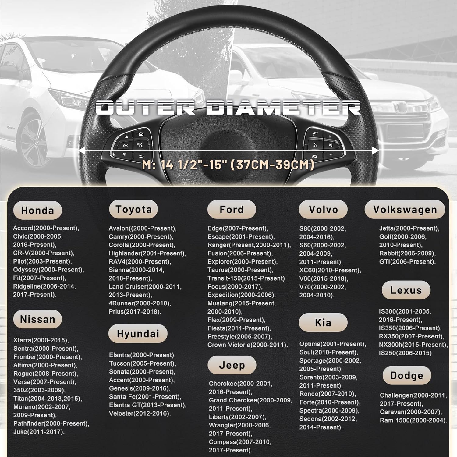 - READY TO INSTALL: Warm up the steering cover, and slip it on your steering wheel. Installation is fairly easy, any adult can install this steering wheel cover. Suitable for standard size steering wheels with outer diameter of 14 1/2-15 inches, please carefully measure the size of your steering wheel before purchasing.
