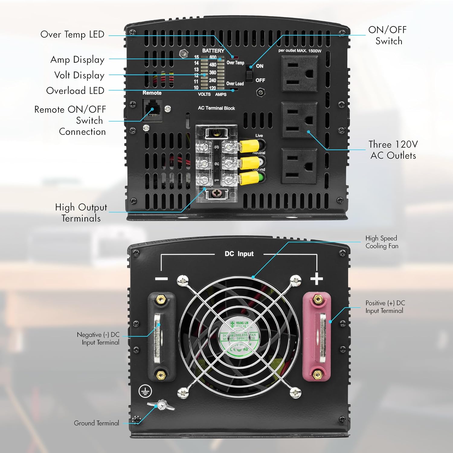 - ENGINEERED TO PERFORM - In your vehicle, boat, motorcycle, RV, truck, RV, motorhome, campground, kids soccer games or anywhere you need to convert DC (battery) power to AC (household) power is where the inverter will shine!