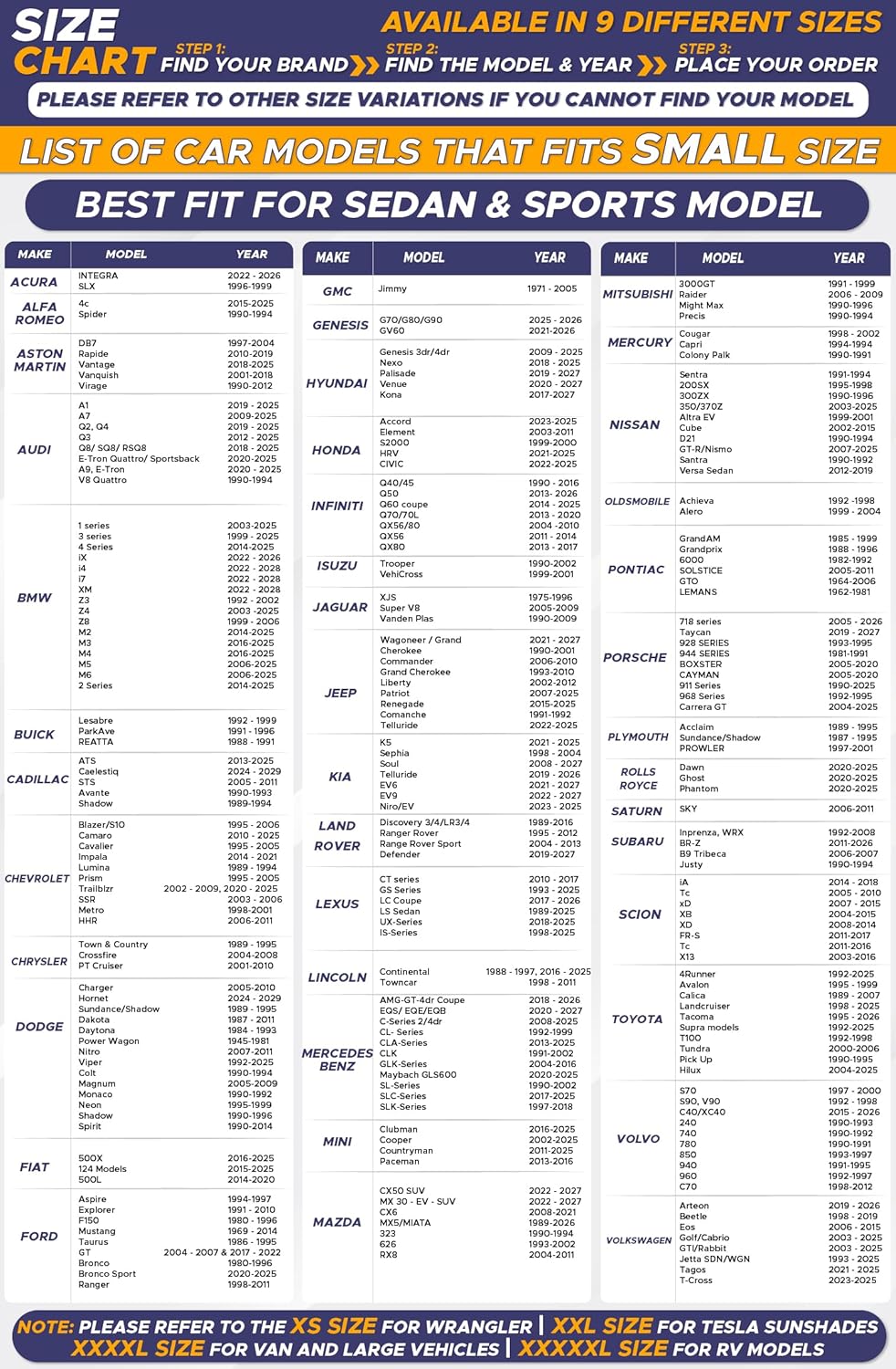 - Multiple Sizes: This sunblocker shade is designed to accommodate a wide range of car sizes, from small sedans to large SUVs; Perfect accessories for keeping your car cool and protected, no matter what vehicle you drive