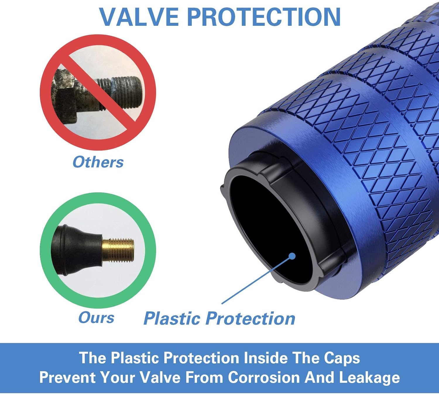 - Special Design β Metal materials are prone to rust in the presence of water and oxygen, which may lead to corrosion on valve body. The plastic inner valve caps design combines the attribution of corrosion resistance of plastic and the stylish look of metal.