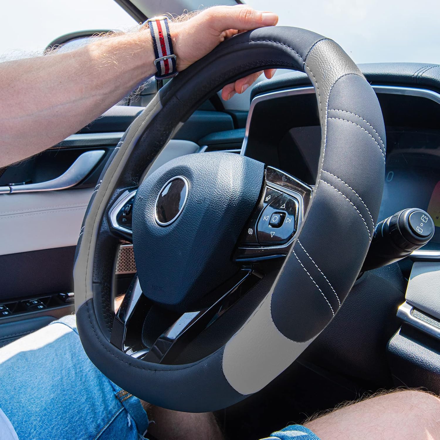 CAR PASS Line Rider Microfiber Leather Sporty Steering Wheel Cover Universal Fits for 95% Truck,SUV,Cars,14.5-15inch Anti-Slip Safety Comfortable Desgin (Black-Gray)