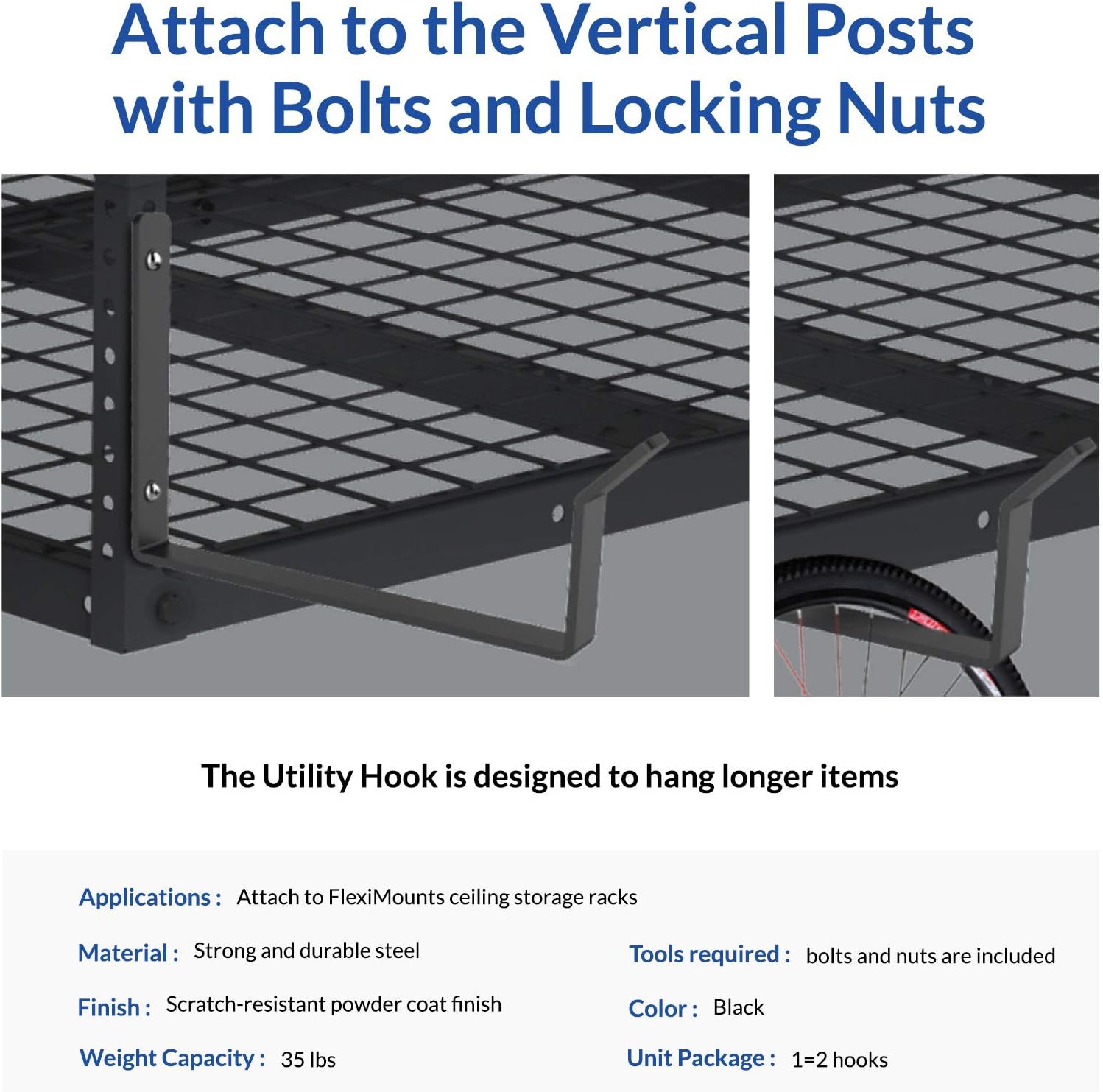 FLEXIMOUNTS 2 Pack Add On Storage Utility Hook Accessory for Garage Ceiling Rack, Max Weight Capacity up to 35lbs, Black