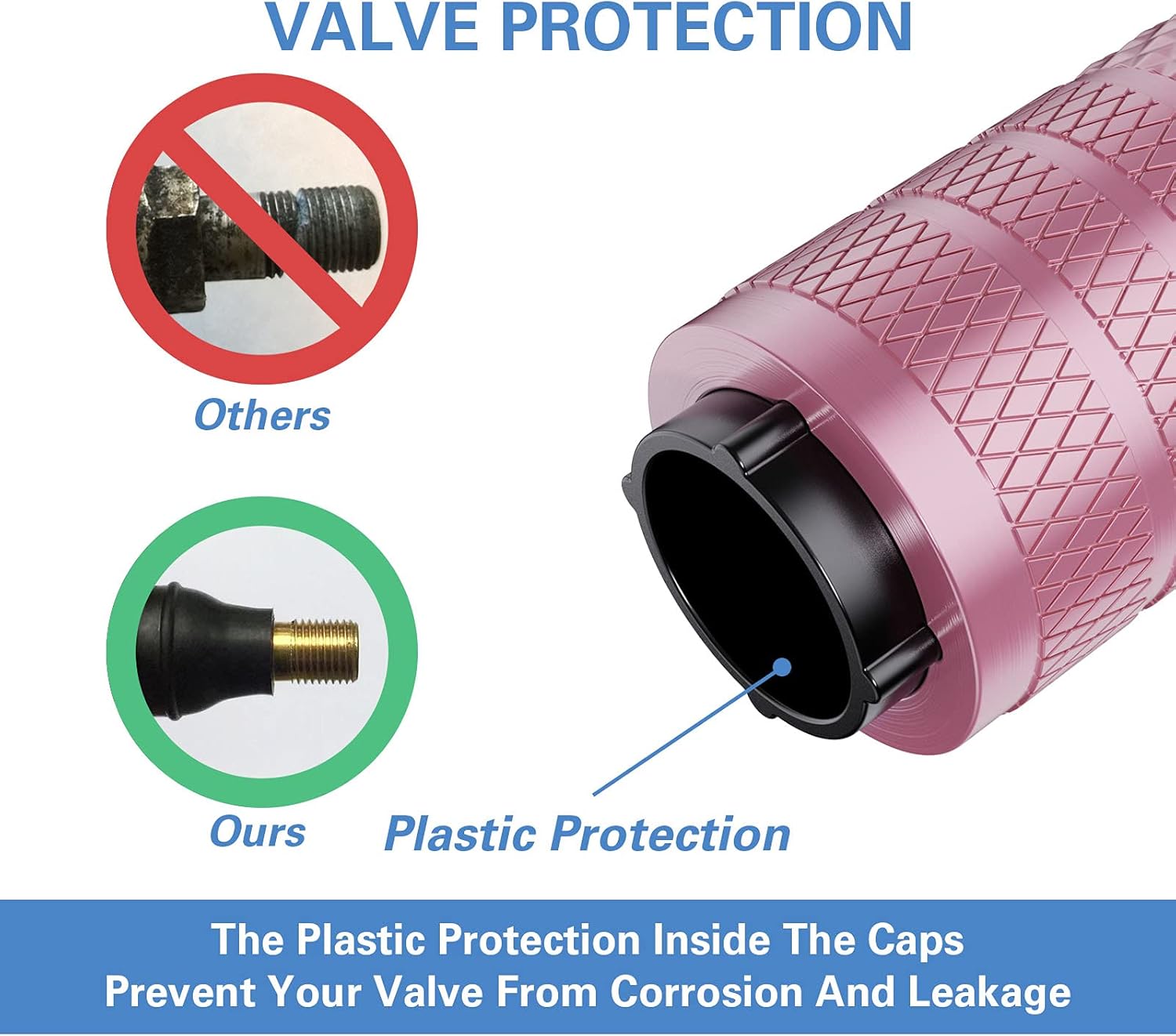 - Special Design β Metal materials are prone to rust in the presence of water and oxygen, which may lead to corrosion on valve body. The plastic inner valve caps design combines the attribution of corrosion resistance of plastic and the stylish look of metal.