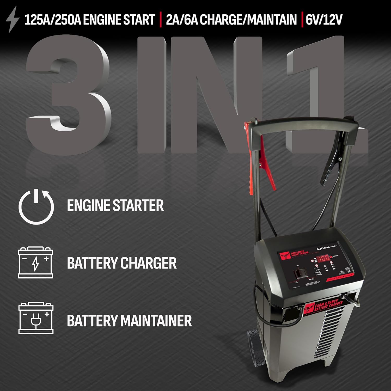 - Immediate Charging Power β Delivers 250-amp 12V engine start, 125-amp 6V engine start, 50-amp boost charge, and 6-amp to 2-amp charging and maintaining