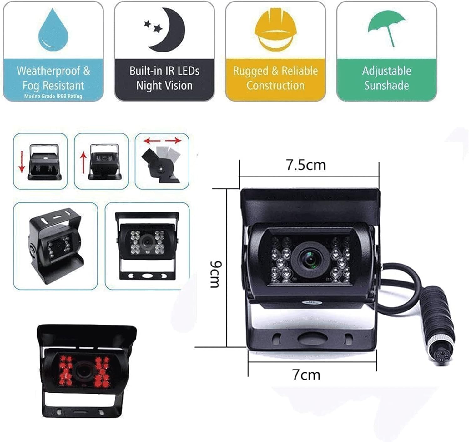 - ăIP68 Waterproof RV Backup Camera (No Guide Lines)ăHard Metal Cased Camera, waterproof and Mud proof. 18 IR LEDs for Night Vision + 120° horizontal wide view angle + 180°vertical adjustable angle to view the blind spots. You can get it work Full Time when connect to constant power source