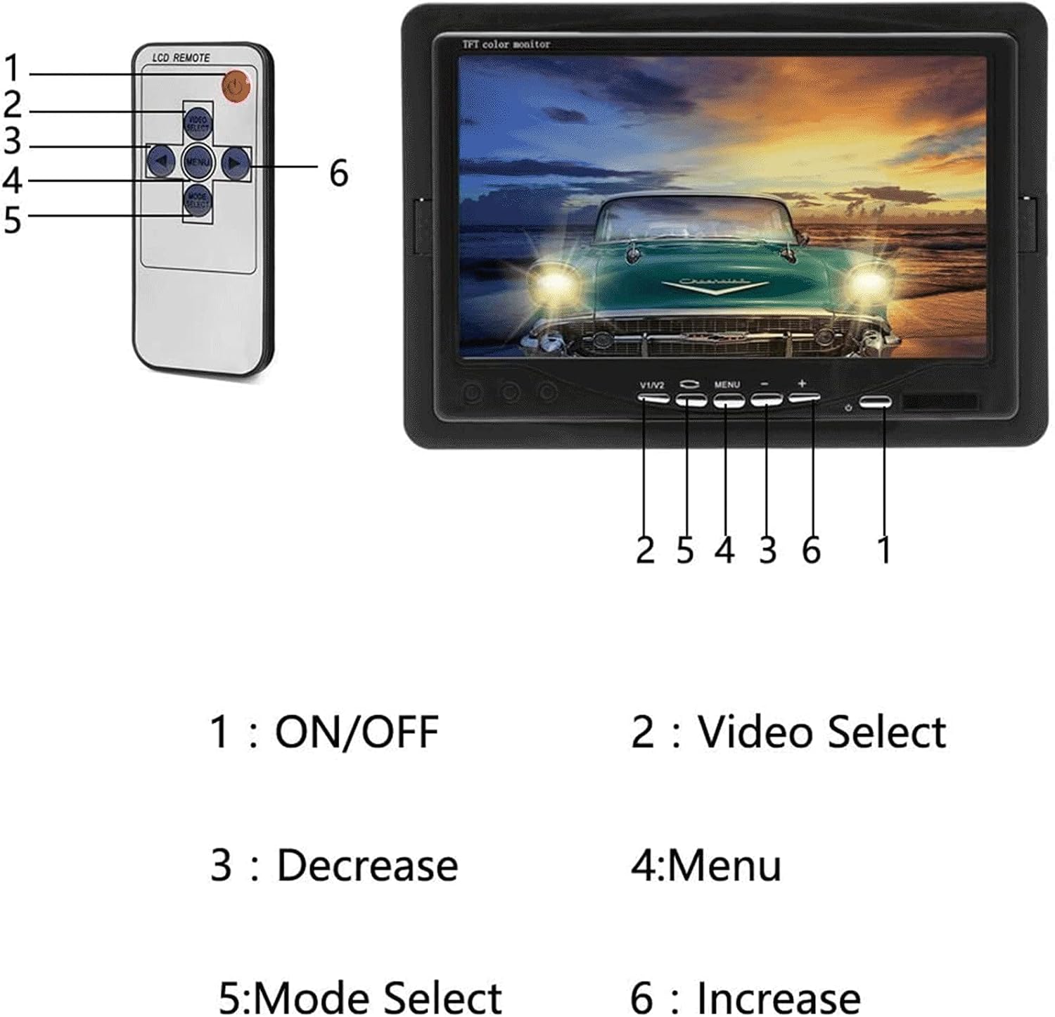 - ă7-inch Screen Car Rear view Monitoră2-channel video input, high resolution image, full color display and low power consumption, adjustable brightness, contrast and color. Image can be rotated horizontally and vertically for mirror or normal viewing