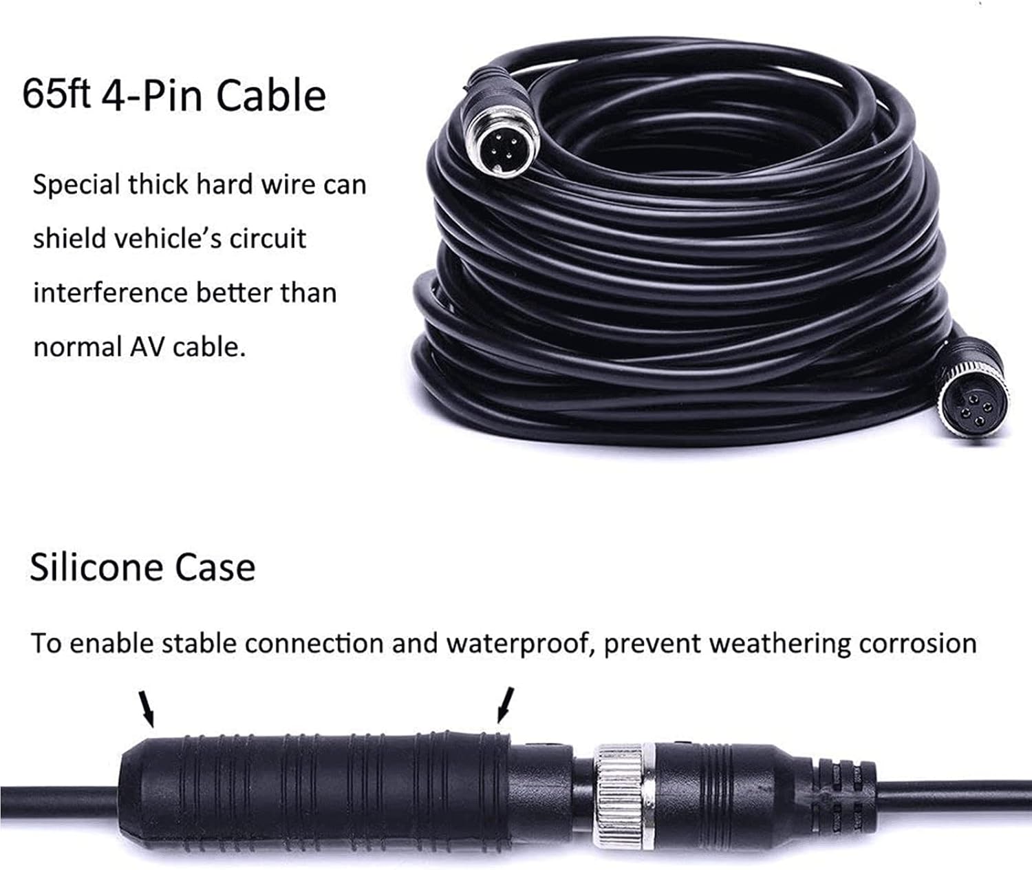 - ăBackup Camera Kit With Extended Aviation 4 Pins Connector CordăStrong anti-interference, more close connection, easy to install. Special thick hardwire can shield vehicleâs circuit interference better than normal AV cable