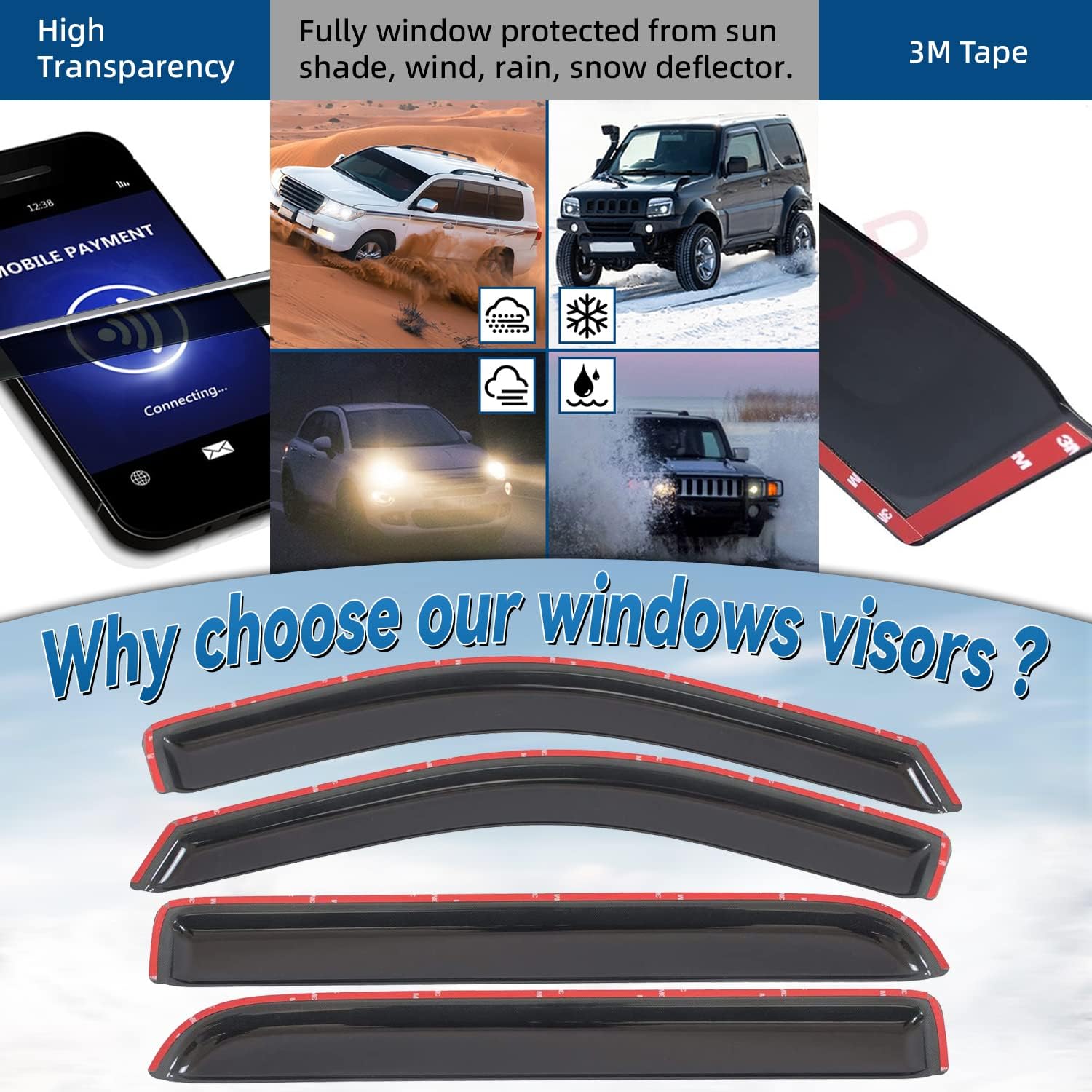 - Package Included: 4pcs front + rear vent window visors (3M Tape Included)