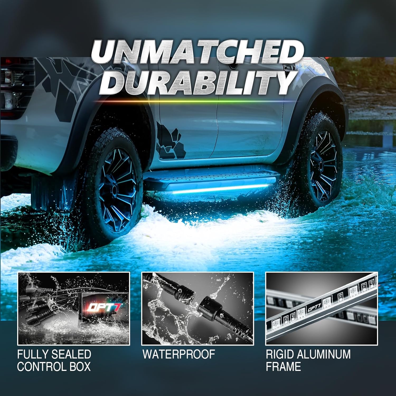 OPT7 Aura Pro Underglow LED Lights Kit for Truck with App & Remote Control, RGB Multicolor Music Modes, Waterproof Rigid Aluminum Light Bar, Exterior Neon Accent Lighting for Regular Extended Cab