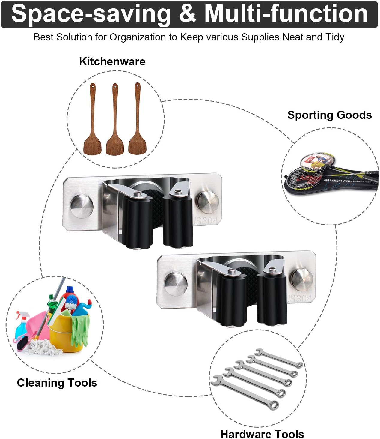 - ăWIDELY USING ăYou can install this wall mounted storage holder on any surface to hang brooms, mops, racks, keys, umbrella, brushes, dust pans, gloves, dusters, baseball bats,etc.