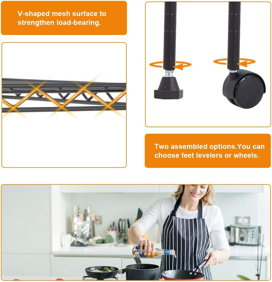 - âăLARGE AND STURDYăďźThe wire shelving unit provide an enormous amount of space and strong shelves. The metal shelf doesn't occupy too much space,but it can create more additional space. The storage shelves use durable steel construction,and to resist dirt buildup and corrosion. Maximum weight capacity per shelf is 150lbs when equally distributed on feet levelers.Maximum entire unit weight capacity is 220lbs when equally distributed on casters.wire shelving unit metal shelf storage shelves.