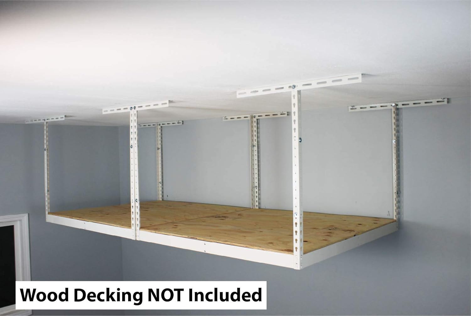 - IMPORTANT REMINDER: Our Overhead garage storage rack frame kit DOES NOT come with wire decks. Decks are NOT included. We recommend that a 3/8" thick plywood be used as adequate decking material for this garage ceiling storage rack to maximize it's storage weight capabilities.
