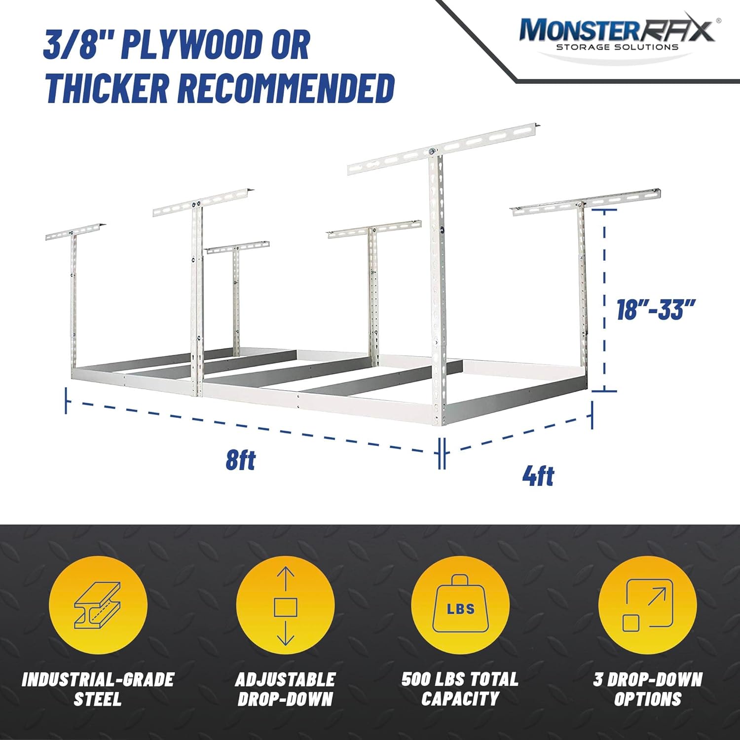 MonsterRax 4x8 Overhead Garage Storage Rack Frame Kit - Hanging Storage Shelves, Ceiling Storage Rack System, Overhead Garage Organizers And Storage, Ceiling Shelving - (White, 18"-33")