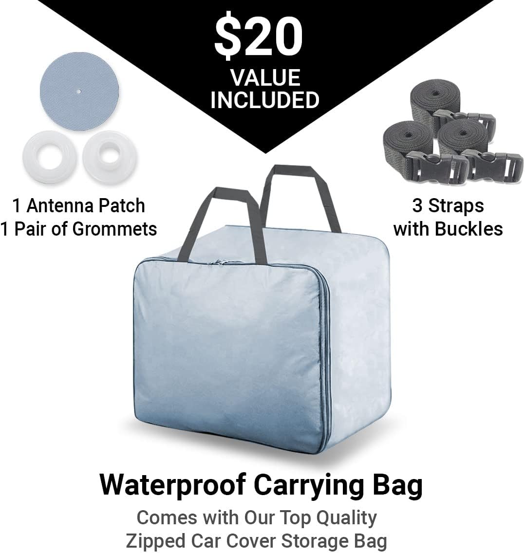 - 100% SATISFACTION GUARANTEE & PREMIUM EXTERIOR ACCESSORIES: Experience the iCarCover difference with our 100% satisfaction guarantee and comprehensive warranty. Each cover has premium accessories, including antenna patches, grommets, wind straps, and a compact storage bag for easy, space-saving storage. We are committed to providing top-quality protection, style, and convenience.