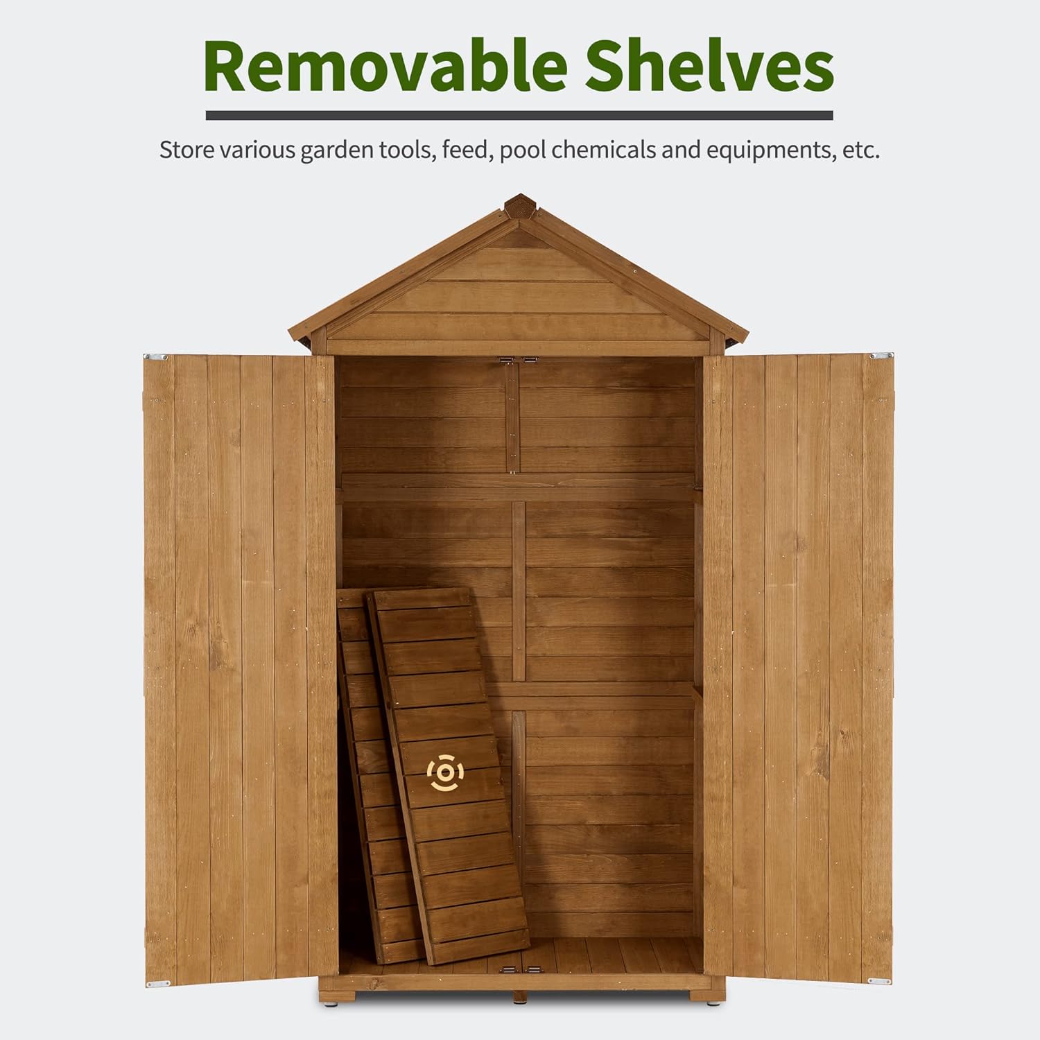 - Space-Saving Large Shed: This tall, compact wood shed is ideal for hiding messy garden tools without taking up too much space; Suitable for gardens, patios, decks, porches, or garages, it provides ample storage in a compact footprint; Dimensions: 35.4" (L) x 18.9" (W) x 70" (H)