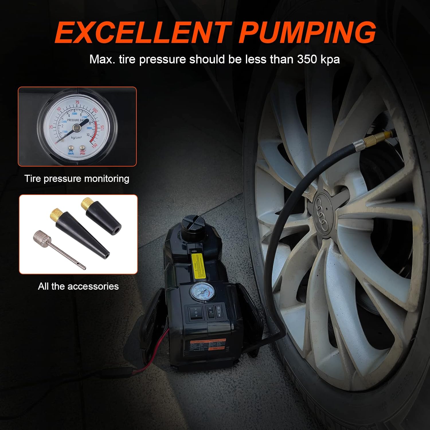 - [Easy Pumping] With a tire inflator pump installed in the electric car jack, no need to worry about the tire-broken emergency in the middle of no where. Equipped with tire pressure display, you can monitor the tire pressure while pumping. Now, Say goodbye to troublesome tire-changing things!