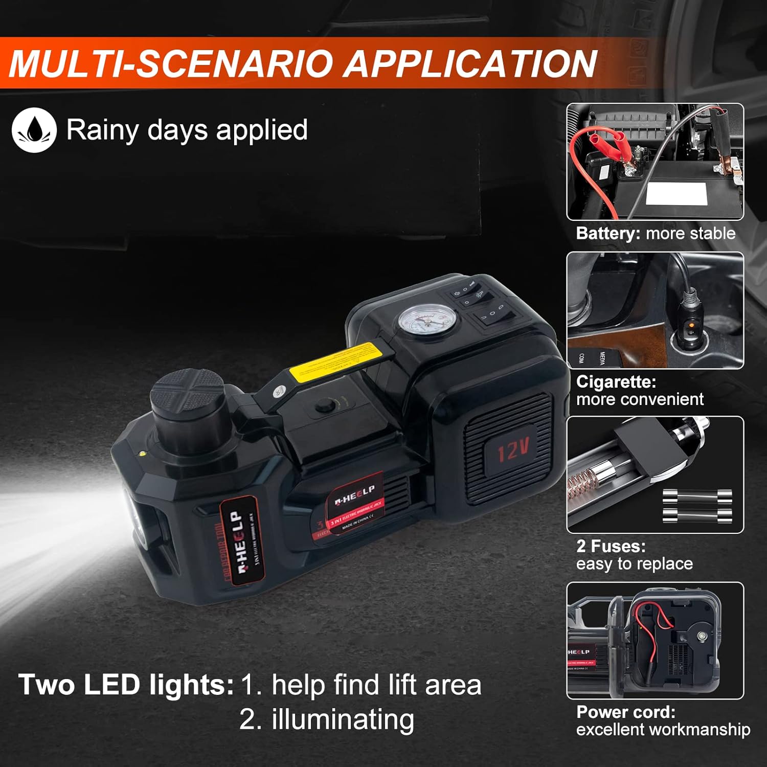 - [Multi-scene Application] This portable hydraulic jack applied whether in your home garage, road trip, car repair shop, farm or halfway emergency. Car jack and the power cable connectors are waterproof, feel free to use on rainy days. Plus, two LED lights helps find your lift area and illuminate your working environment even in the dark midnight.