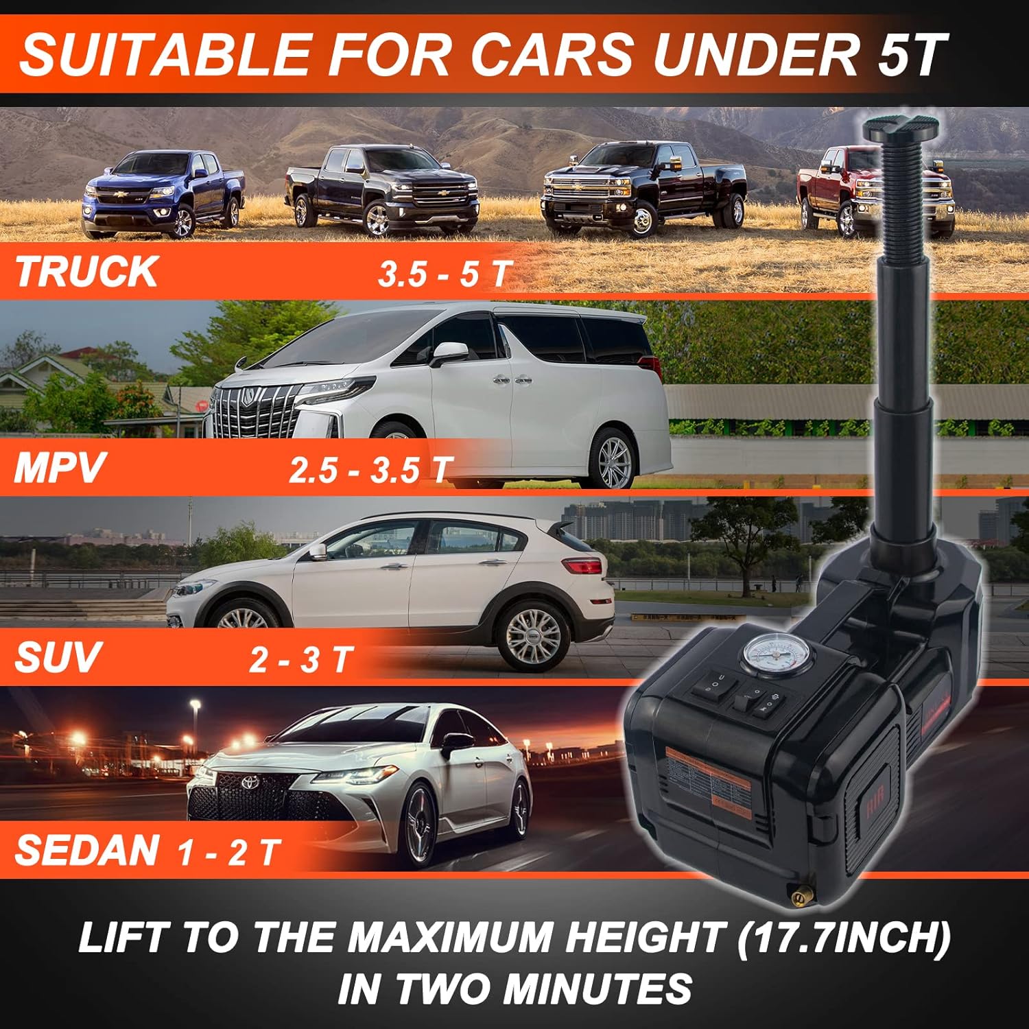 - [Universal Applied] Car jack hydraulic has two ways of power supply: battery clip with 12V DC power socket and car cigarette lighter. The high-power motor nearly matches all the vehicles in the market, sedan, SUV, MPV, truck, pickup. Morever, you can use the car jack on your motorcycle, or some other heavy items. Please make sure you operate carefully on the flat ground and the load weight never exceed its MAX.