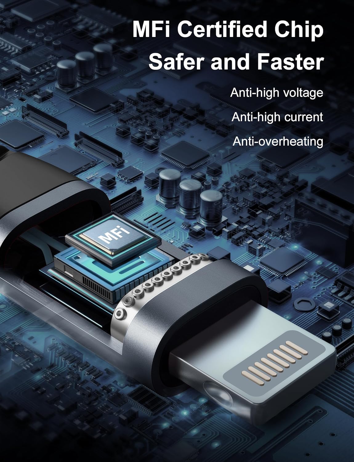- FAST LIGHTNING CABLE: iPhone charger cable made of high quality copper wire, which can support 2.4A fast charging and 480 Mbps rapid data transmission speed. With safe MFi Certified Chip, it ensure 100% compatibility with your lightning devices, no masseges pop up.