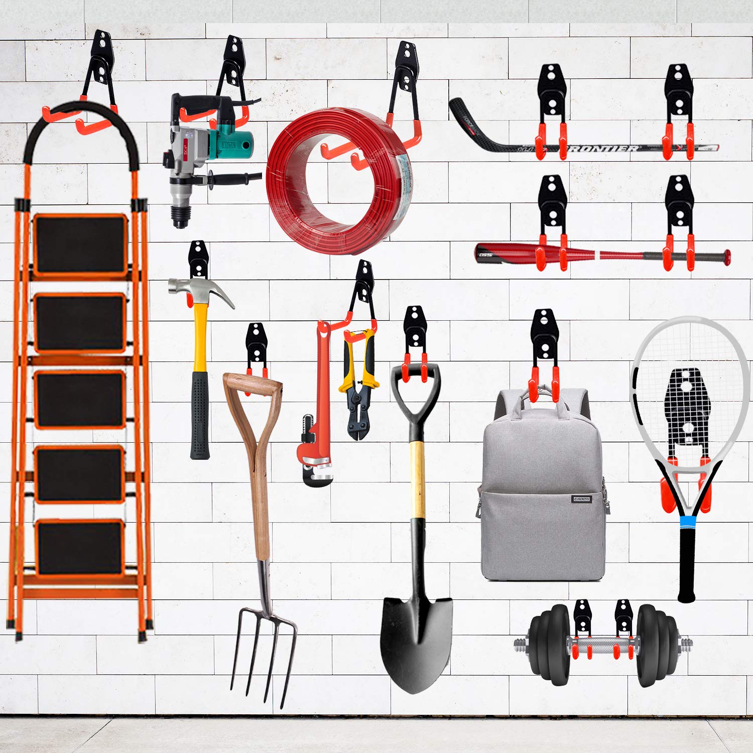 - ★--PREMIUM QUALITY -- The garage storage hooks are made of thick steel with anti-slip PVC dipping coated preventing the scratching , Sturdy design provides superior load-bearing capacity, which allows ladder hanger to hold various tools firmly, including power tools, garden tools, shovel, weed eater, broom, ladder, bicycle, ropes, hoses, etc. They're durable to endure a life-long time using experience.