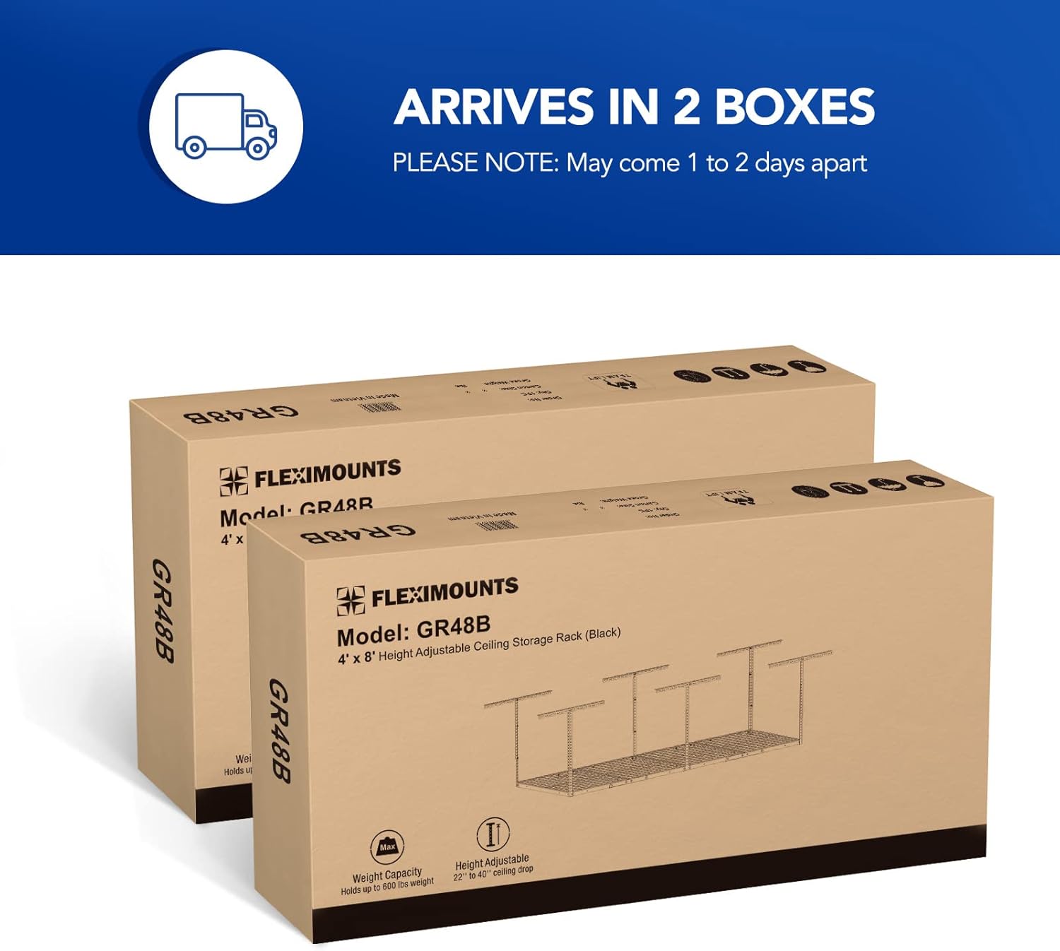 FLEXIMOUNTS 4x8 Overhead Garage Storage Rack, Adjustable Organization System, Heavy-Duty Metal Ceiling Racks, 2 Pack, Hammertone