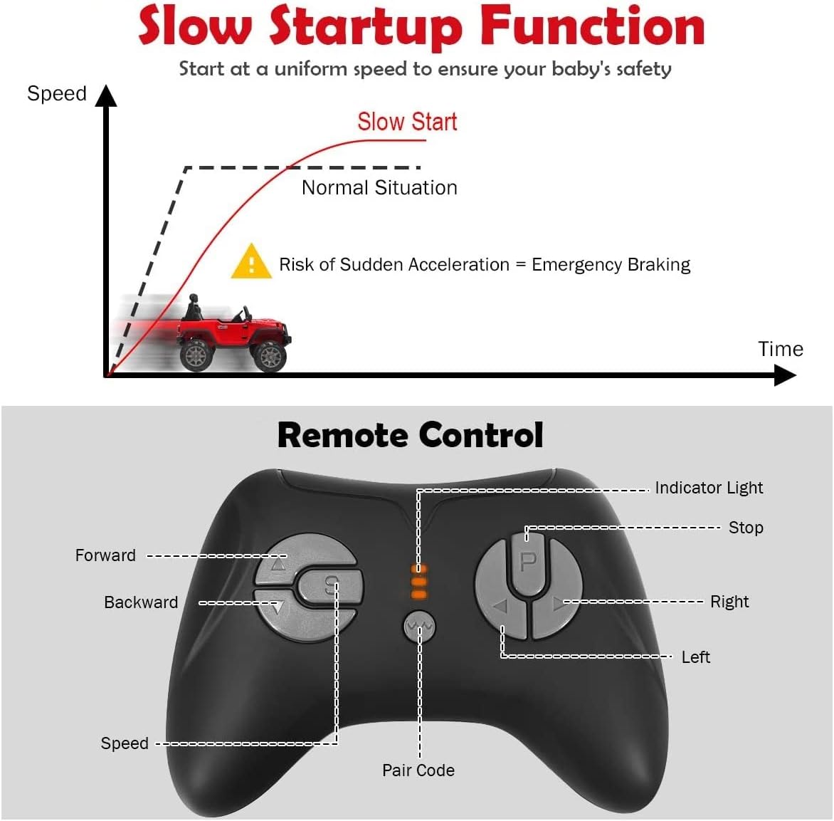 - 【Security Assurance】 The kids car is equipped with a slow start function to avoid the risk of sudden acceleration. Besides, 4 wear-resistant wheels is made of superior PP material without leaking or tire burst. Its spring suspension system and seat with multi-point safety belt offer safer driving experience.
