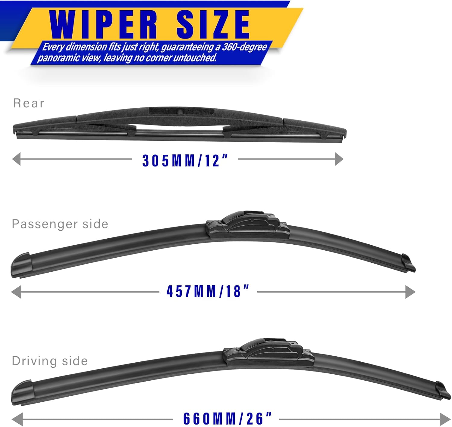 - ăWORRY-FREE SHOPPINGă 3Pcs wiper blades 26"+18"+12" and Instruction Manual. One Year warranty! Refund or return anytime in one year, Long life, smooth engagement.
