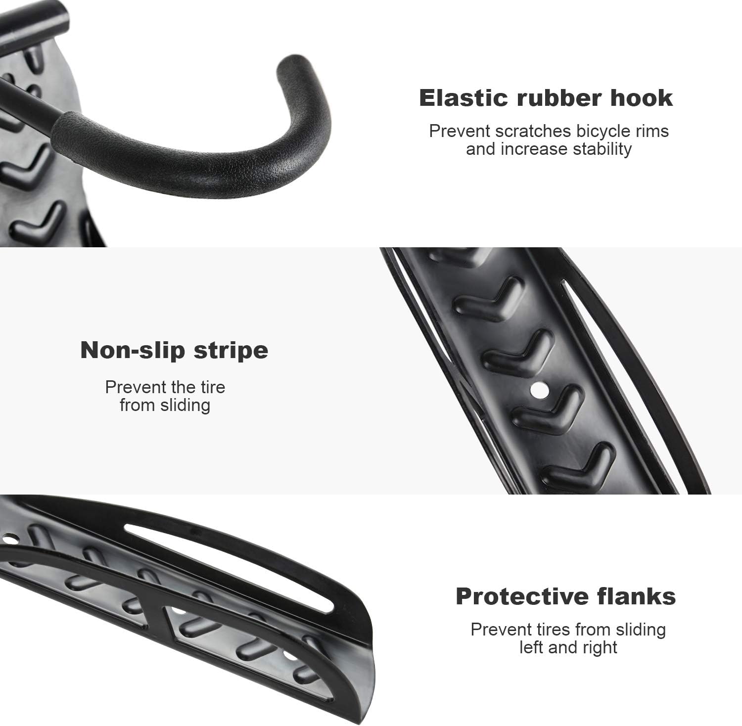 - ANTI-SCRATCH MATERIAL - Rubber-coated hooks to avoid rim or tire damage. Garage hooks made from durable steel, coated for rust resistance allow you to use them indoors or outdoor. With non-slip stripe design can prevent slipping and balance your bike vertically against the wall. Just display your bike as art to a simple kickstand.
