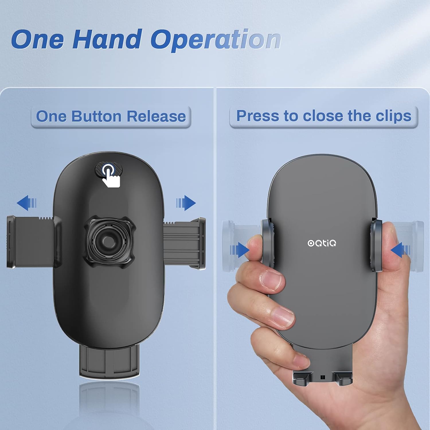 - Quick One-Button Release: Effortlessly mount and remove your phone with the one-button release system. Simply press the release button on the back of the cradle, and the clamp arms will smoothly slide open.