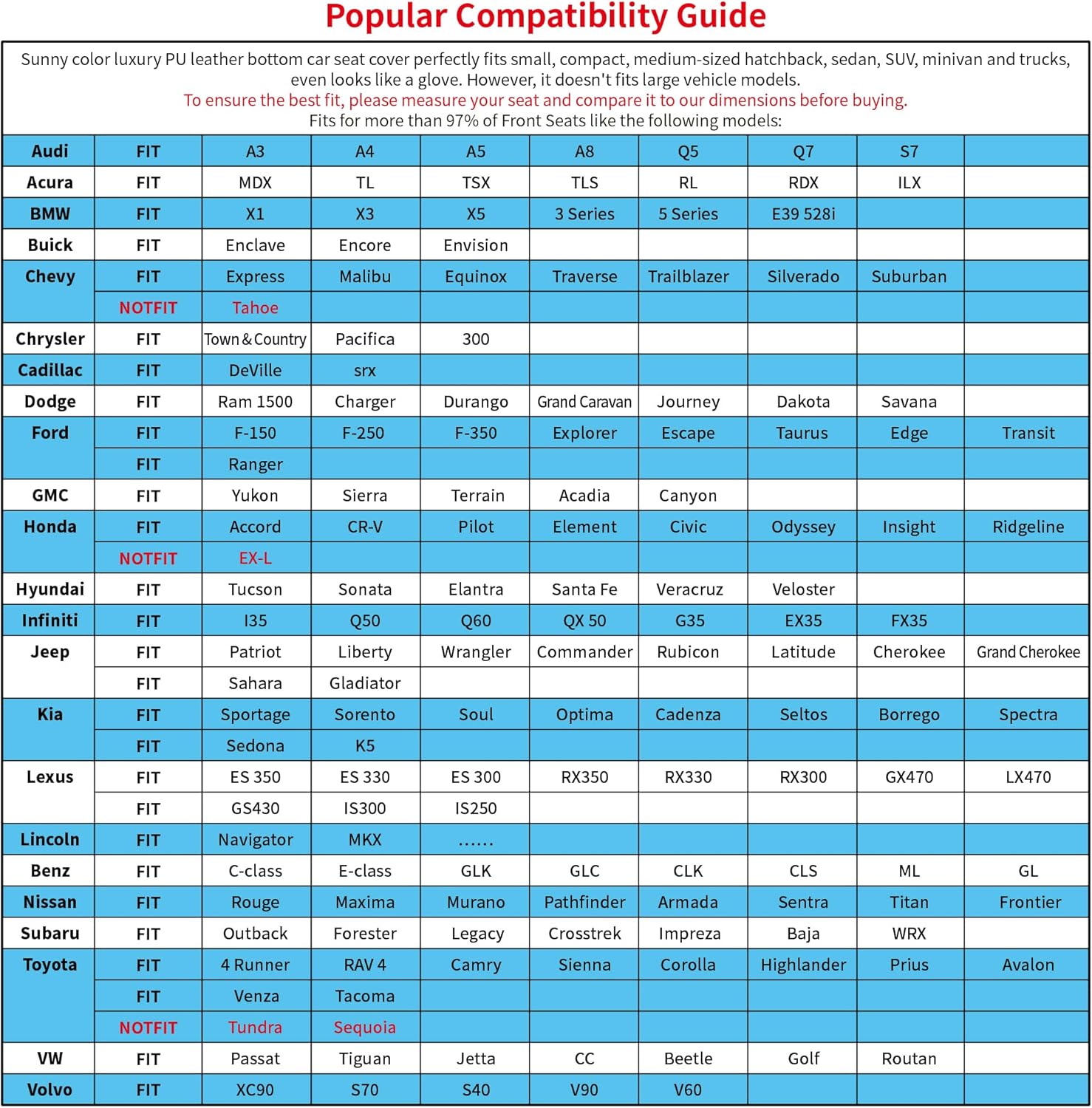 - ✅Universal Car Seat Covers-Sunny color seat covers for front seat measures 19.7*20.8 inches, suitable for all cars, Suv, trucks and rare vans etc. It doesn't fit the seat of Full-Size Truck such as Silverado, TUNDRA, F-150 and full-Size SUV such as Tahoe, Expedition, Acadia. To ensure the best fit, please measure your seat and compare it to our dimensions before buying.