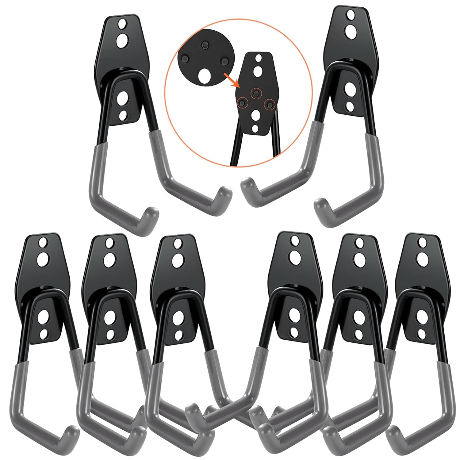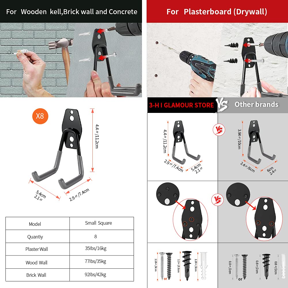 - EASY TO INSTALL & BEARING CAPACITYThese garage hanging hooks are suitable for various walls. You can install them effortlessly. For plaster walls: (1) Insert black expansion screws into the two large holes of the heavy duty garage hooks; (2) Low speed drilling or manual tightening of steel screws. For wooden/brick/concrete walls: (1) Mark the two small holes for the garage hangers on the wall; (2) Drill holes and insert white expansion pipes; (3) Drill in steel screws.