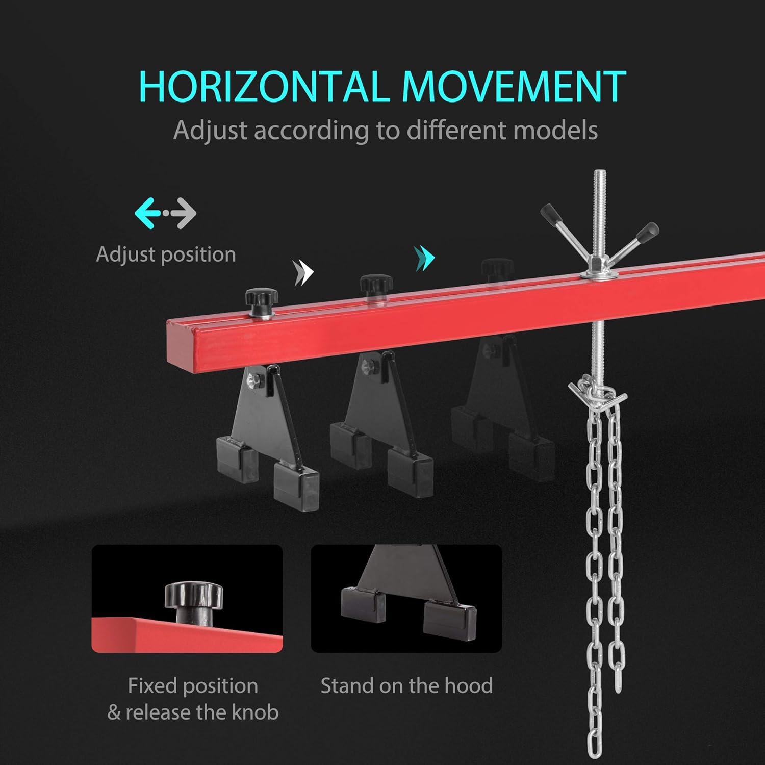 - EASY TO OPERATE - First, place black triangle support bases in the appropriate position, then fasten the engine with iron chains, and turn rotating hoists to raise or lower the motor to the proper height based on your needs; Designed with rubber materials on round knobs and hoist handles, which can protect your hands in use