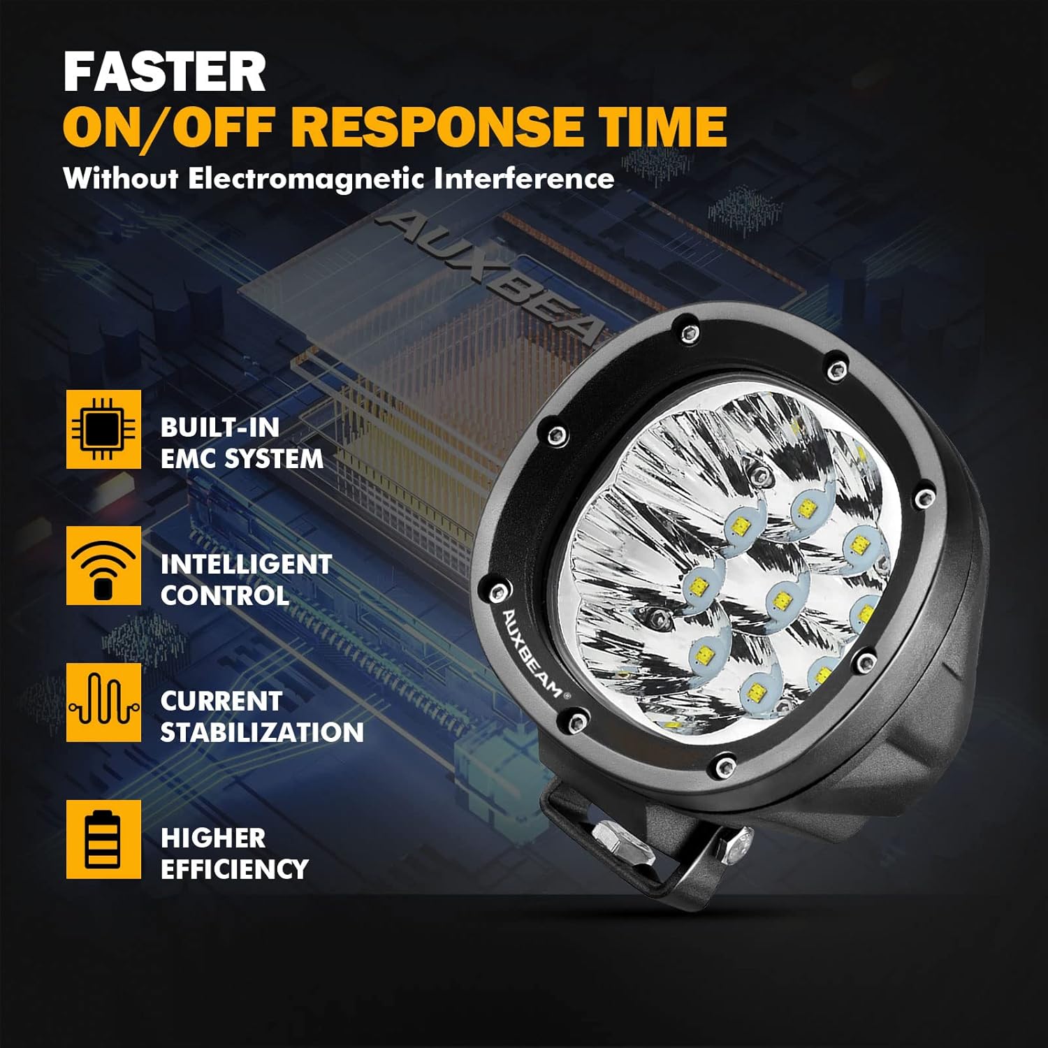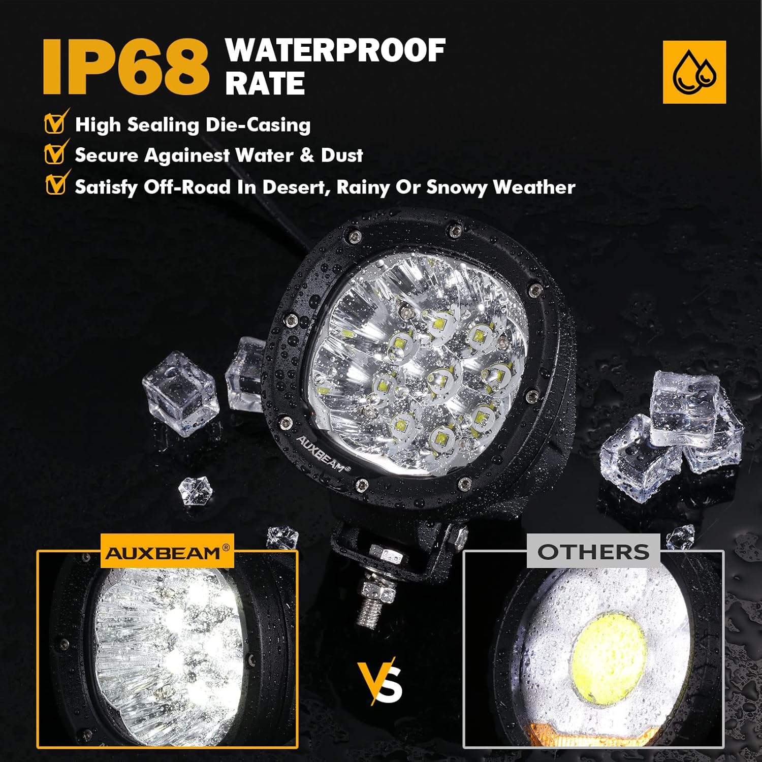 - ăFast Cooling & IP67 RateăAuxbeam off road lighting ues new ADC12 shell, oversized heat-sink allow LEDs to run cooler and brighter. Ensure round LED pods lifespan exceeds 50,000 hours. IP67 waterproof, dustproof, shockproof, withstand extreme environment, ensuring a long-lasting performance