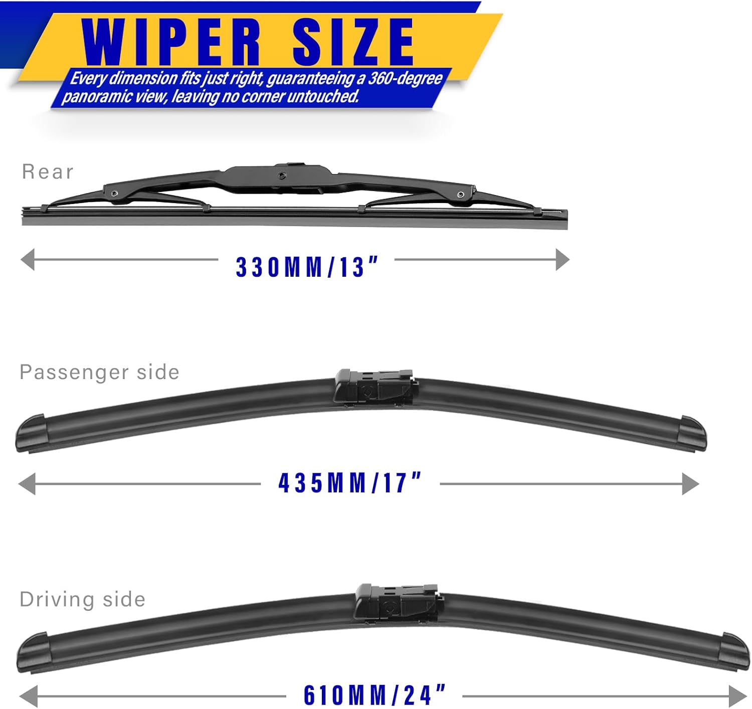 - ăWORRY-FREE SHOPPINGă 3Pcs wiper blades 24"+17"+13" and Instruction Manual. One Year warranty! Refund or return anytime in one year, Long life, smooth engagement.
