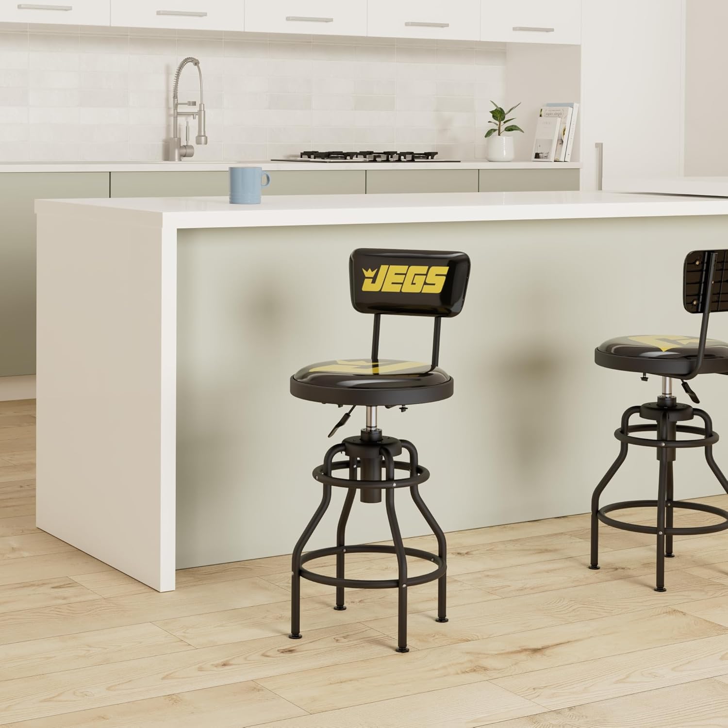 JEGS Hydraulic Shop Stool with Backrest - Adjustable Height (28" to 32.5") & 360 Degree Swivel - Vinyl Padded Seat & Backrest - Heavy Duty - Up to 300lb Capacity