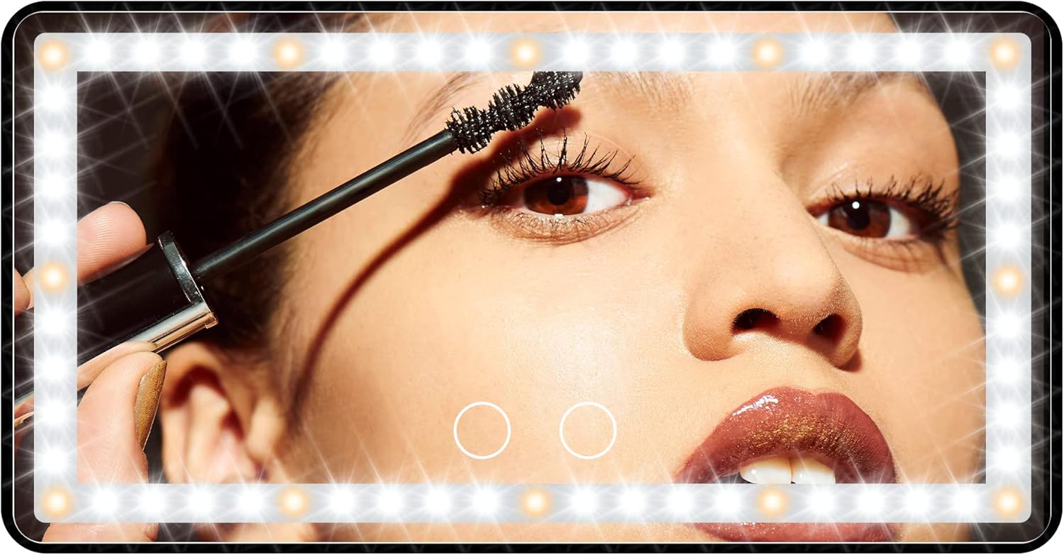 - DIMMABLE BICOLOR LED LIGHTS: The car makeup mirror has 12 yellow lights and 48 white lights, which is 40% brighter and 60% less energy than normal bulbs. Short press the 2 sensor switches to replace 3 light colors: white, yellow, white and yellow. Long press for dimming according to what you need. 2500-6500K color temperature is equivalent to outdoor sunlight, the makeup is naturally no difference