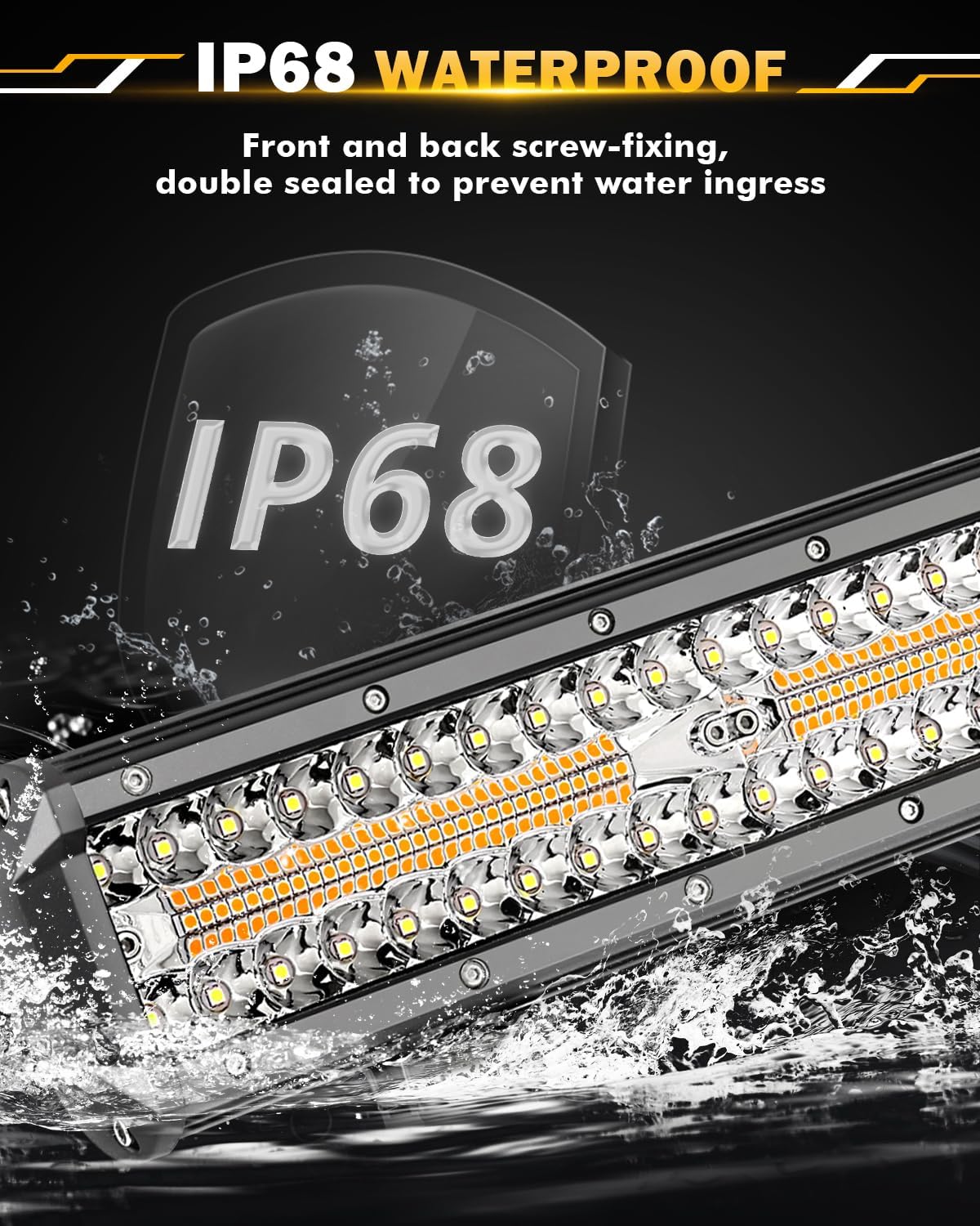- 【IP68 WATERPROOF RATE】6 modes light bar built in IP68 waterproof, adopts upgraded waterproof die-casting aluminum housing and advanced sealing technology to withstand any harsh environments and weather conditions. Also, our lights are with built-in no electromagnetic interference (EMC), resolve the issue of radio interference and flickering