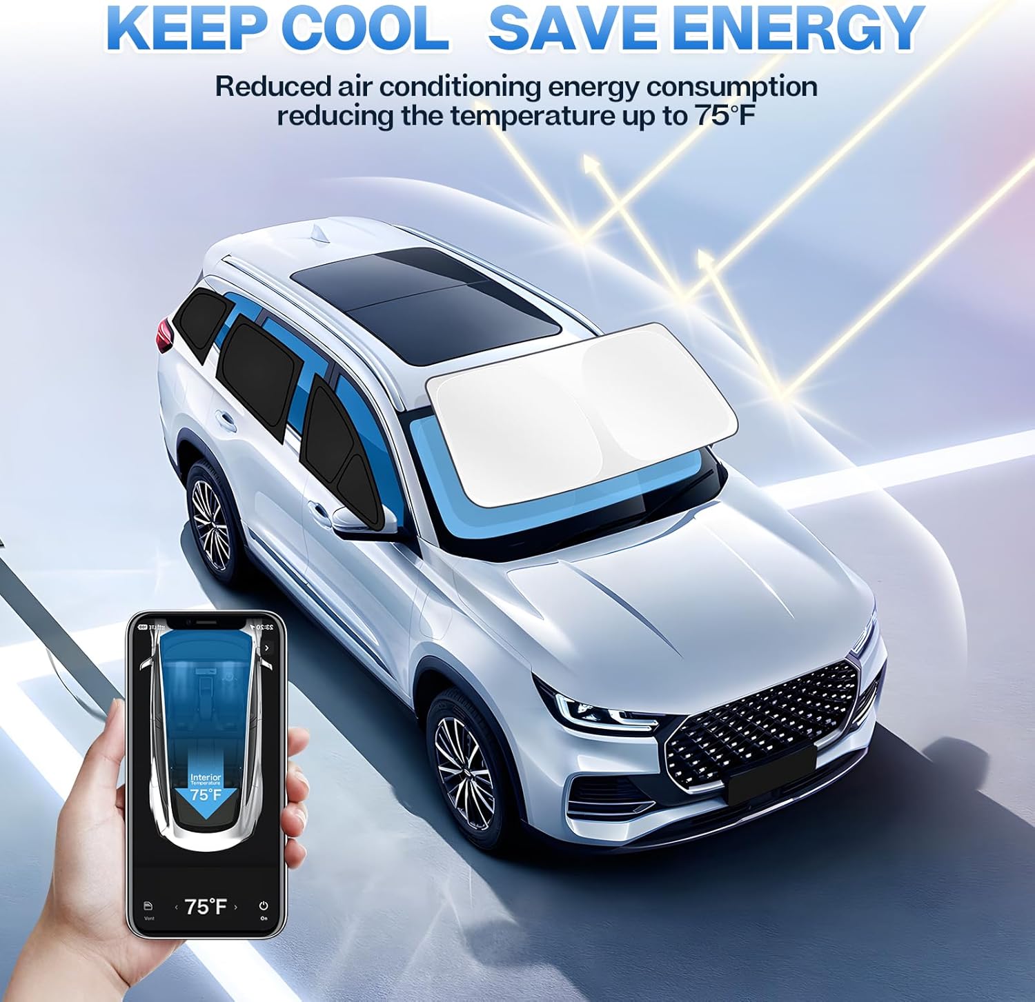 - Versatile Use & Quick A/C Cooling Perfect for daily parking, road trips, camping, or mid-drive naps, this sunshade adds both privacy and protection. Its reflective, insulated design helps block harmful UV rays and lower cabin temperature—keeping your pets, family, and car interior safe and cool. With reduced heat buildup, your A/C cools the cabin faster and uses less energy, saving fuel and boosting comfort during every drive.