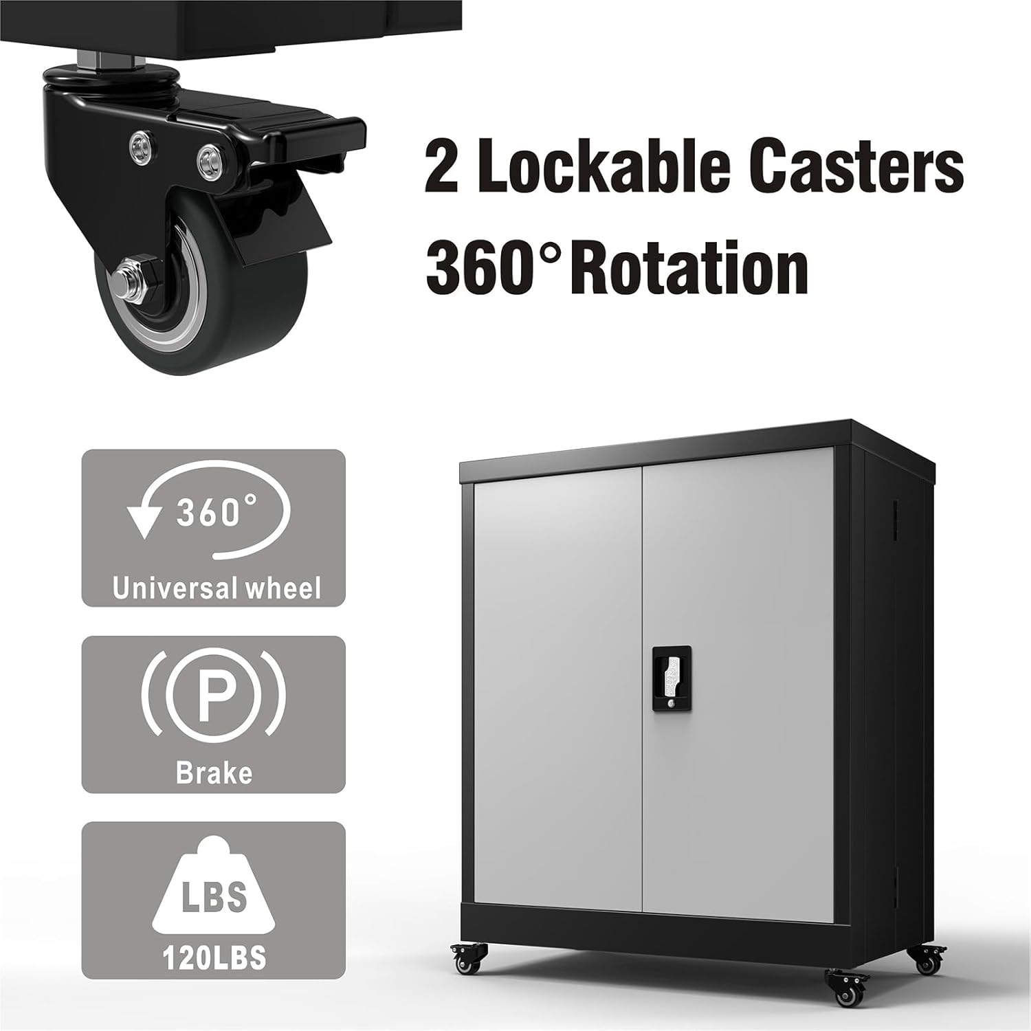 LUCYPAL Metal Storage Cabinet with 2 Doors,Steel Storage Cabinet with Adjustable Shelves and Wheels,Locking Tool Cabinets for Office,Home,Garage,Black&Grey 31.5" H