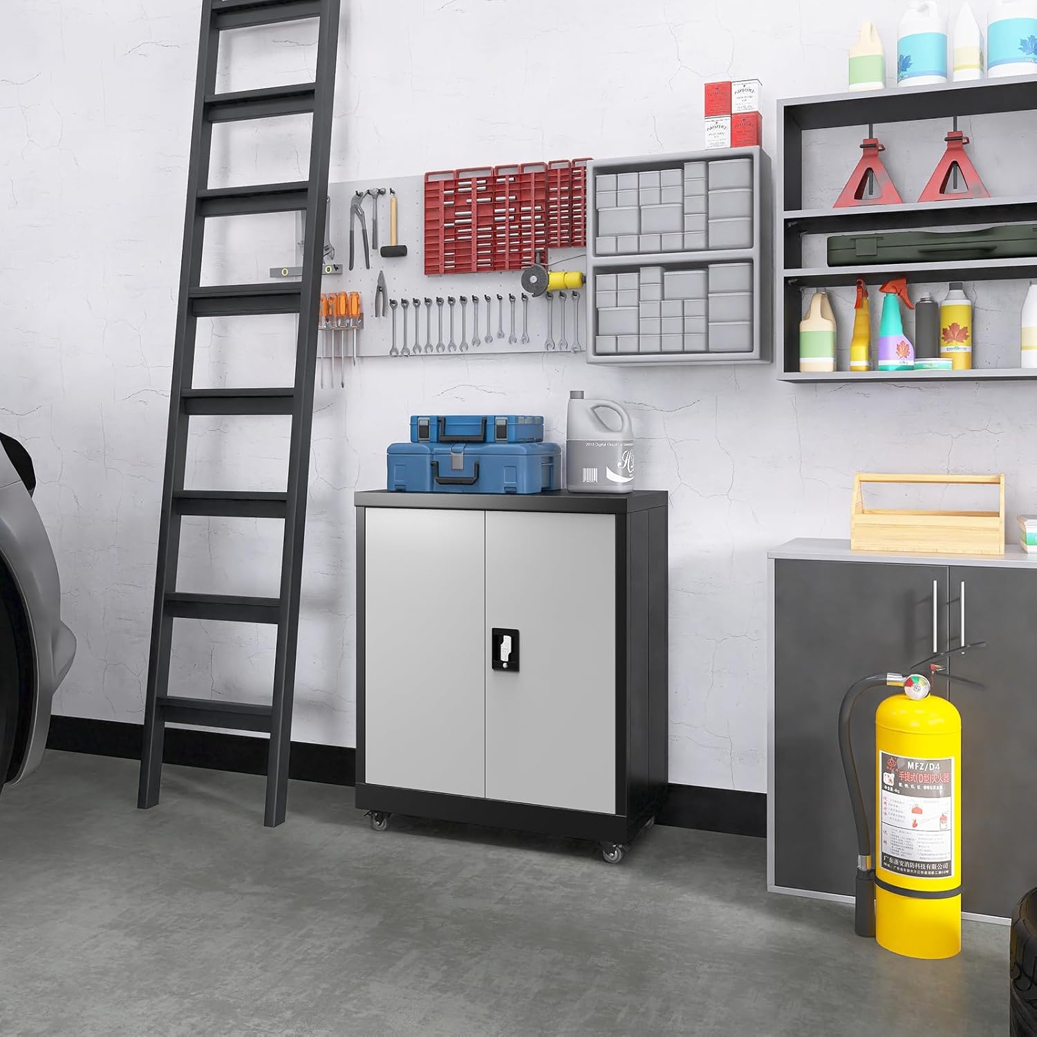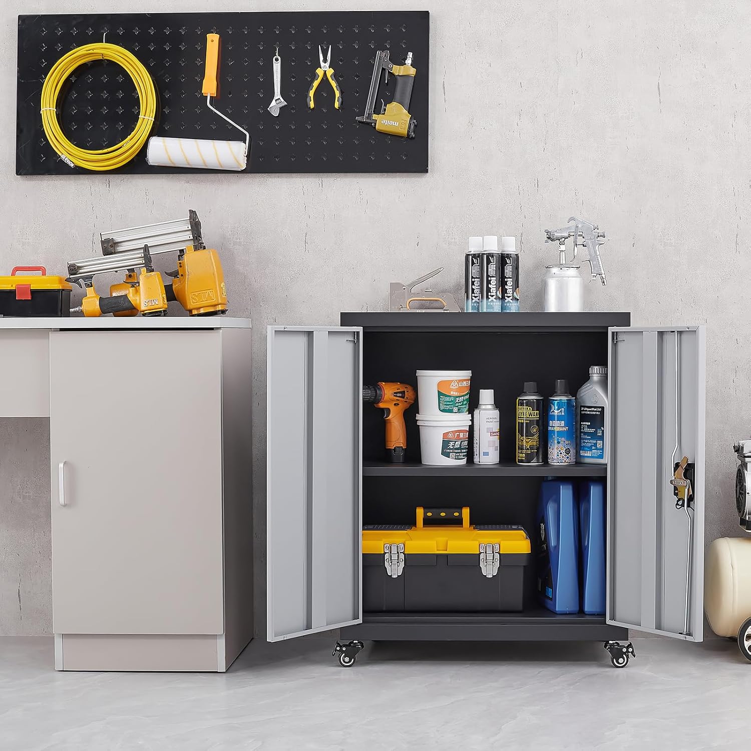- ăLockable Door with Master KeyăOur locking garage cabinet comes with 2 hinged doors and 2 keys. With the master key, the lock core can be removed to solve the problem of missing key, and can also prevent unauthorized access. It can guarantee the safety of your personal important documents and belongings in a real sense.