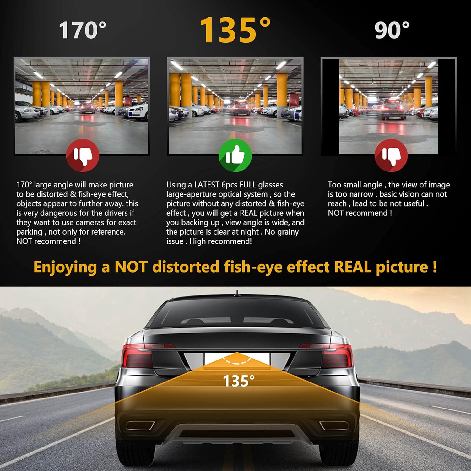 - Backup camera license plate with a LATEST 6pcs FULL glasses F1.8 large aperture optical system and horizontal 135 degree wide view angle lens, the picture without any distorted effect,you will get a REAL picture when you backing up.Also you can check the invisible blind spot clearly and make parking safe and simple