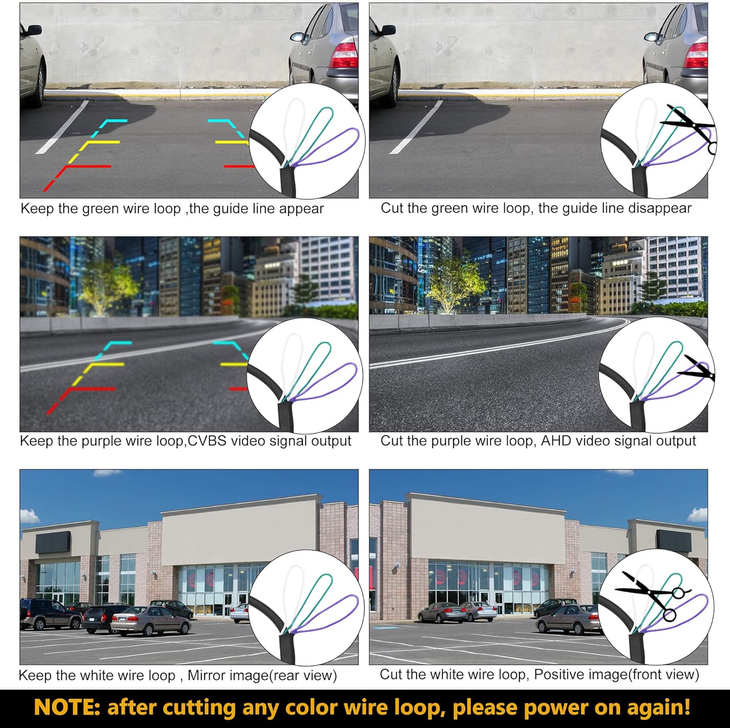 - Caution: According to our experience, some cheap or old Android stereos(before 2020) have the setting of AHD or TVI video signal input option, but the truth it does not work, because their hardware inside do not support it. If so, please use the default CVBS video signal output (do not cut the purple or blue wire loop, otherwise you will get a black and white screen).