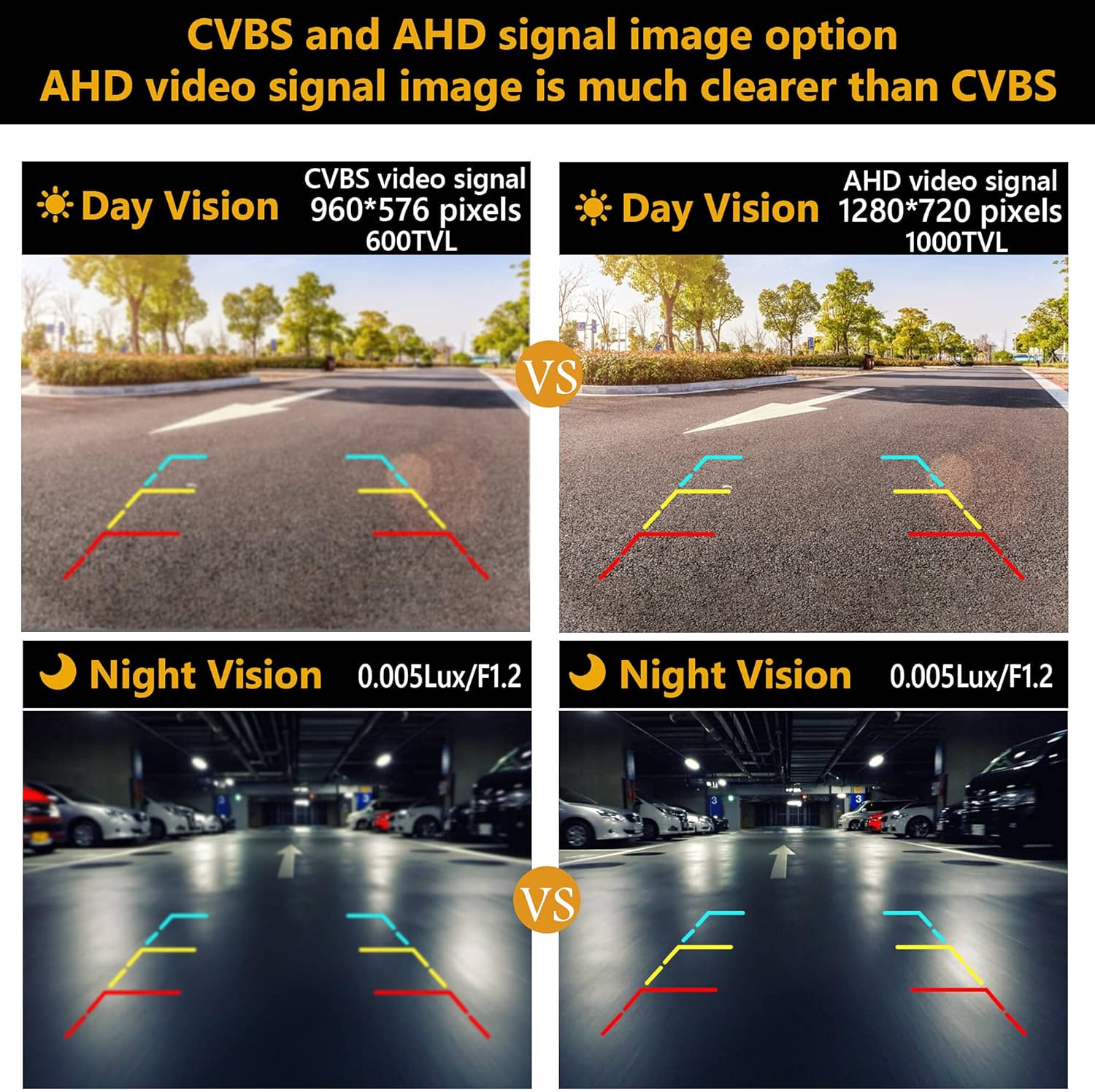 - Reverse camera license plate support 3 kinds: CVBS,AHD and TVI video signal output(great for Android stereos).CVBS by default,cut the purple wire loop to choose AHD format video signal (AHD,720P,30fps) and cut the blue wire loop to choose TVI format video signal (TVI,720P,30fps). It with starlight level night vision (0.005Lux,excellent low-light performance),you never worry about parking during night, rainy day or in dark garage.