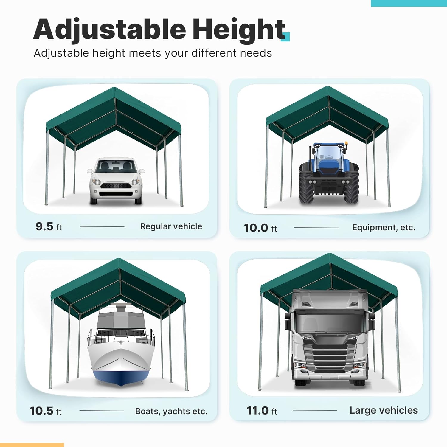 - 【4 Adjustable Heights】- There are 4 options for the side height of this metal carport, which are 6.5ft, 7.0ft, 7.5ft, 8.0ft, accordingly peak height 9.5ft, 10.0ft, 10.5ft, 11.0ft. You can choose a suitable height for all kinds of your needs.