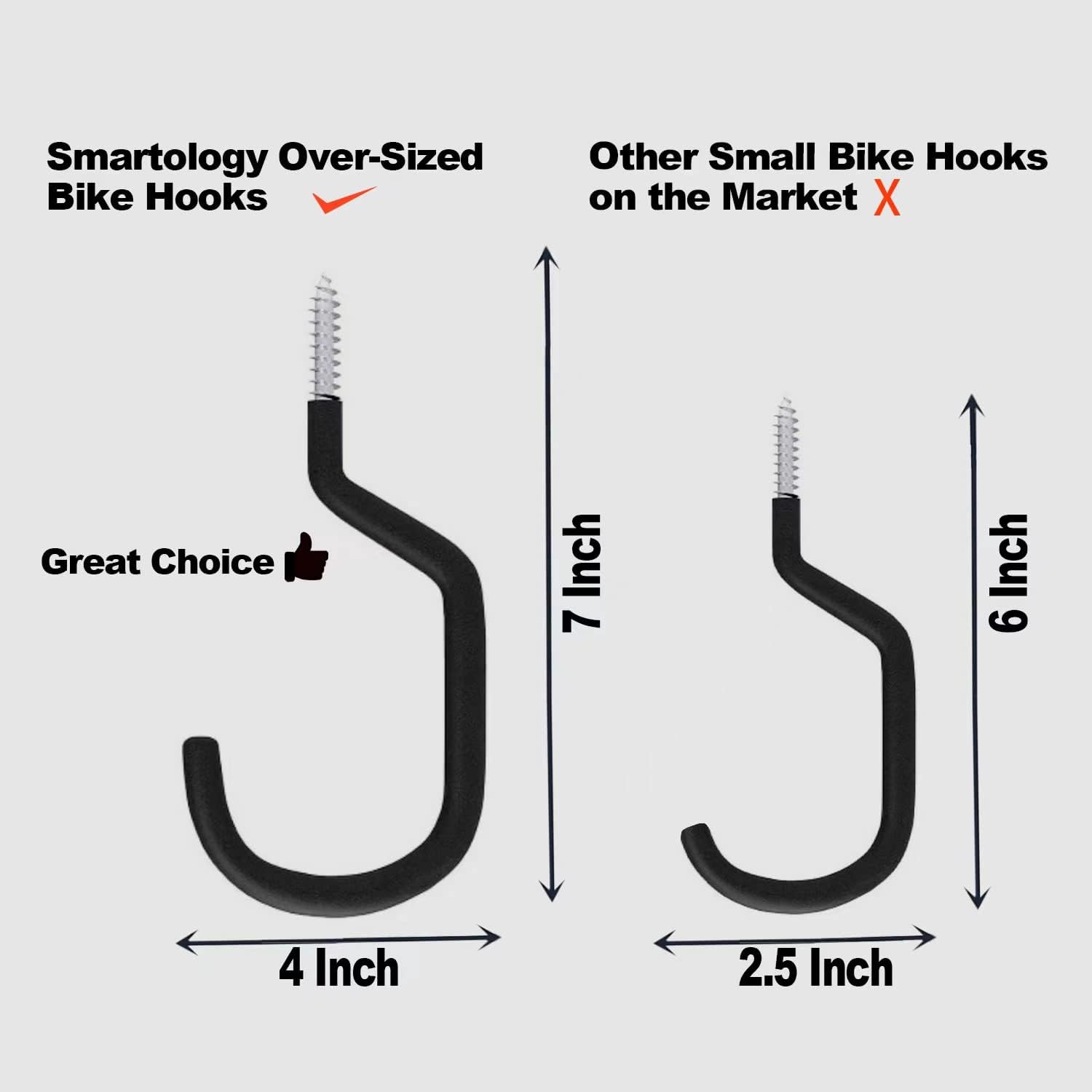 SMARTOLOGY Extra-Large Bike Hook, Bicycle Storage Hanger, Rubber Coated Heavy Duty Screw-in Ceiling Hooks for Tools, Garage Wall Organizer, 4 Pack, Fits All Bike Types, Vertical Bike Racks & Stands