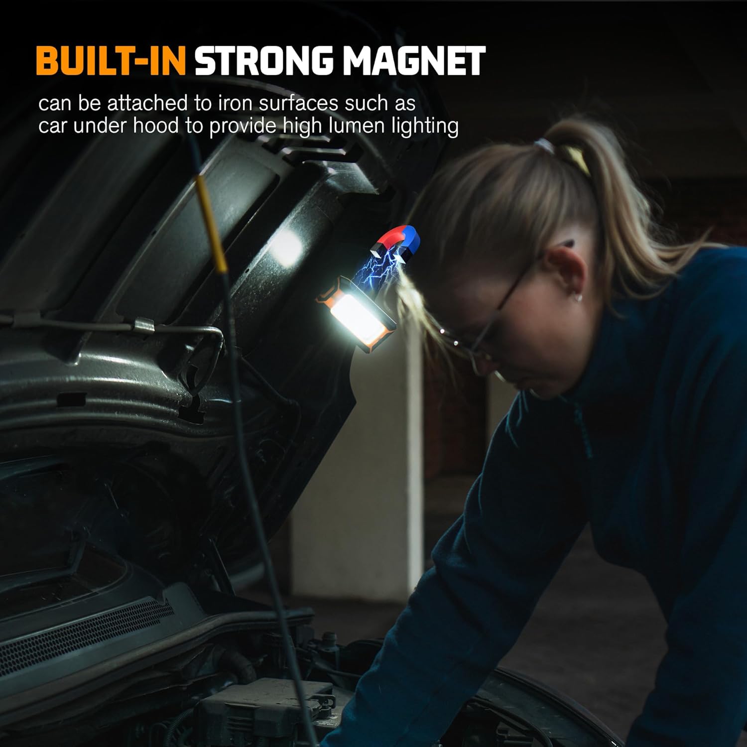 - 【STRONG MAGNETIC & CONVENIENT HOOK & WALL HANGING HOLE】Built-in strong magnet, led portable work light can be attached to iron surfaces such as car under hood to provide high lumen lighting. The hook design allows magnetic rechargeable light to be hung on objects such as tents. Wall hanging hole will allow magnetic mechanic light to be well-storaged on the wall, making your DIY work bench much more neat and tidy.
