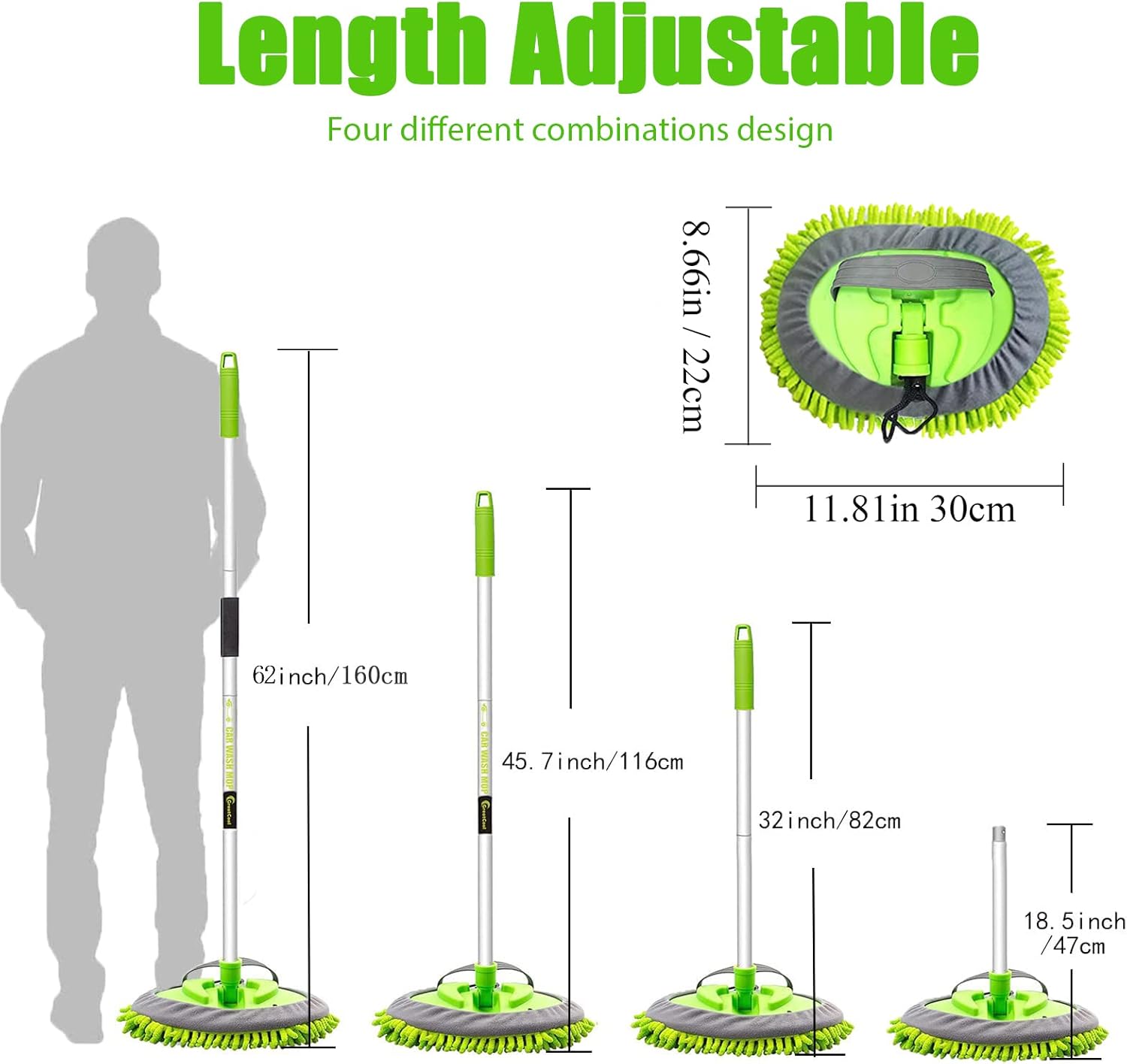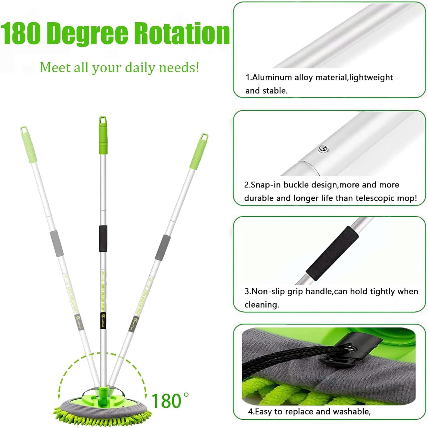 - 【180°Rotation Multi-Angle Cleaning】- The lightweight car wash mop has a non-slip grip to ensure it holds tightly, and also offers the 180-degree adjustable mop head, which helps you clean the different angle place easily, avoids bending to get everything done. You can manually adjust the handle length to meet your diffrent daily needs.